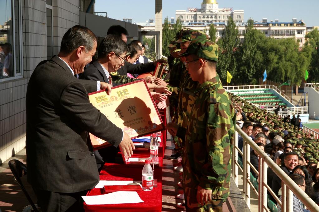 先進(jìn)營代表、組織獎獲獎單位代表、先進(jìn)連代表、隊列匯操優(yōu)勝連、內(nèi)務(wù)衛(wèi)生評比優(yōu)勝連代表上臺領(lǐng)獎,與會軍訓(xùn)團(tuán)成員分別為他們頒獎。
