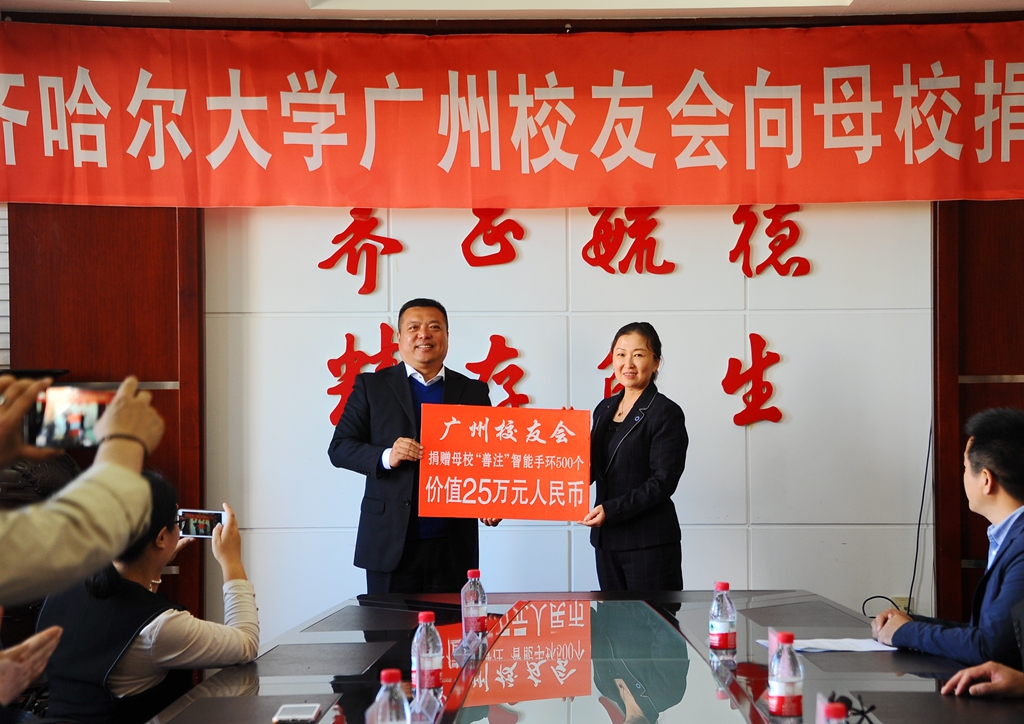 劉德權(quán)代表廣州校友會向母校贈送“善注”智能愛心手環(huán)