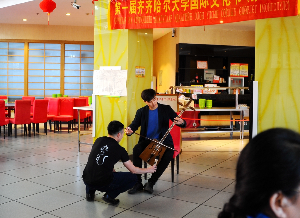活動中,蒙古留學(xué)生表演了精彩的蒙古歌舞和樂器演奏等節(jié)目,將留學(xué)生餐廳中的氣氛一次次推向高潮。