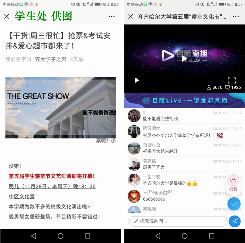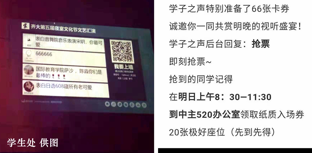 晚會充分融入了“互聯(lián)網(wǎng)+”的時代特點,將線上互動和線下演出緊密結合起來,通過“齊大學子之聲”微信公眾平臺進行了搶票活動,吸引了同學們的極大關注。并通過“目睹直播”進行了在線直播,眾多在校生、畢業(yè)生刷屏關注,直播熱度居高不下,成為校園熱搜話題。同時還通過回復“我要上墻”進行了留言互動。