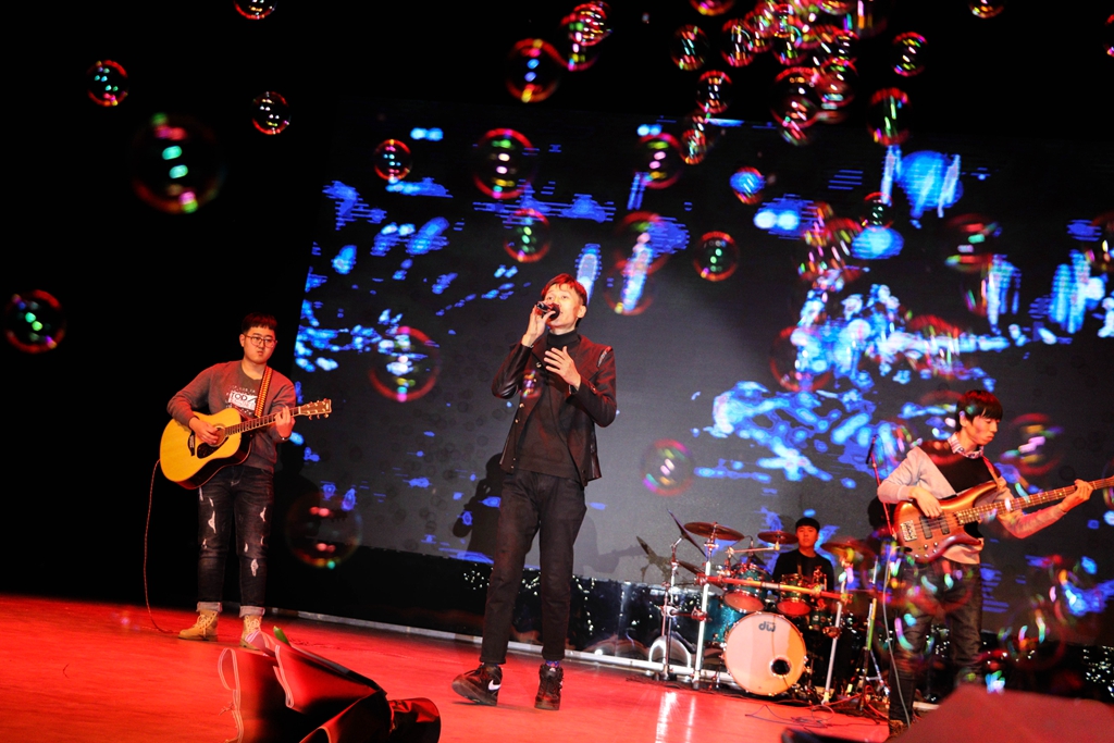 我校老牌學生樂隊--火柴樂隊登場,感人肺腑的前語,寥寥幾語道盡樂隊史。BEYOND的《冷雨夜》帶動觀眾們輕聲哼唱,回首曾經(jīng)的歲月;原創(chuàng)歌曲《渴望黎明》點燃全場,每個人搖晃著手中閃光燈的光芒,一同渴望著最美的黎明。