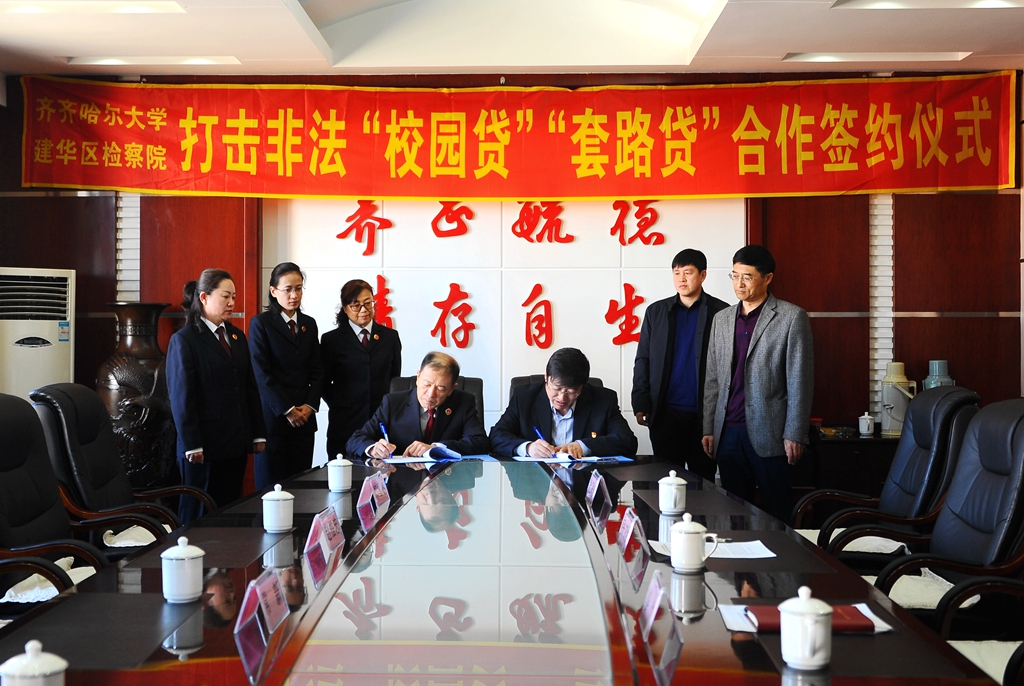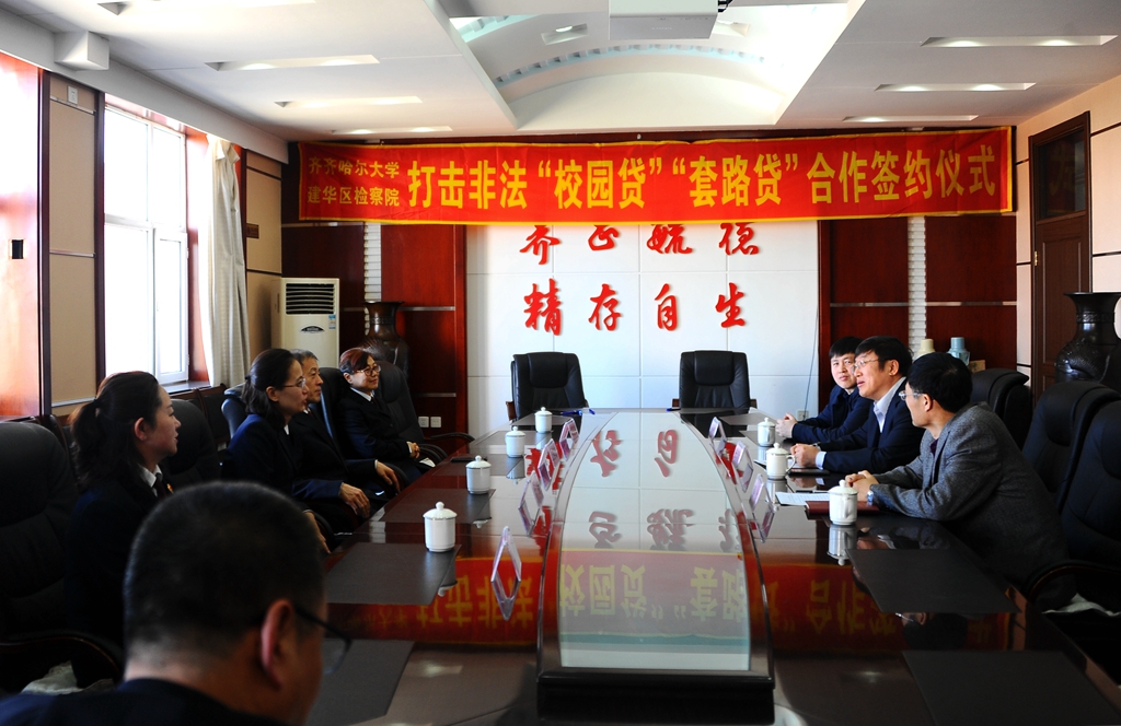 為保護(hù)在校學(xué)生依法使用助學(xué)貸款,嚴(yán)厲打擊非法“校園貸”“套路貸”等違規(guī)行為,保障學(xué)生合法權(quán)益不受損害,4月25日上午,我校與建華區(qū)人民檢察院合作簽約儀式在辦公樓504會(huì)議室舉行,建華區(qū)人民檢察院黨組書記、檢察長趙福忠,齊齊哈爾市人民檢察院民事檢察部部長常新,建華區(qū)人民檢察院副檢察長鄭雪冬,我校黨委副書記張文治、學(xué)生工作部(學(xué)生處)部(處)長姜波、武裝部(保衛(wèi)處)部(處)長杜海權(quán)等出席簽約儀式并進(jìn)行了座談。張文治主持簽約儀式。