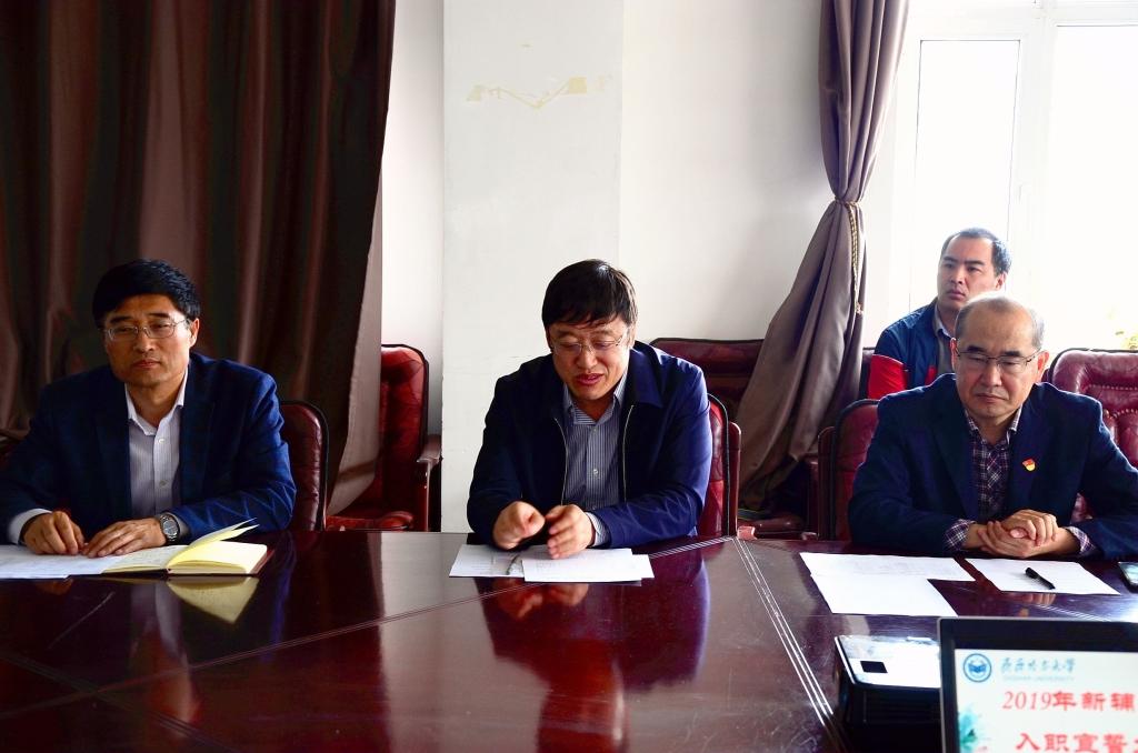 張文治在講話中代表學(xué)校對(duì)新入職的8位輔導(dǎo)員表示誠摯歡迎,他指出,輔導(dǎo)員是開展大學(xué)生思想政治教育的骨干力量,是高校學(xué)生日常思想政治教育和管理工作的組織者、實(shí)施者、指導(dǎo)者。輔導(dǎo)員應(yīng)當(dāng)成為學(xué)生成長成才的人生導(dǎo)師和健康生活的知心朋友。他希望新入職輔導(dǎo)員一要強(qiáng)化素養(yǎng),努力學(xué)習(xí)提高,要不斷學(xué)習(xí)黨的理論知識(shí)和實(shí)踐業(yè)務(wù)知識(shí),內(nèi)化素質(zhì),外塑形象,促進(jìn)自身不斷向?qū)I(yè)化、職業(yè)化、專家化方向發(fā)展;二要提高政治站位,強(qiáng)化責(zé)任擔(dān)當(dāng),要以“我將無我,不負(fù)學(xué)生”的精神狀態(tài)與工作情懷,全力做好學(xué)生工作;三要廉潔自律,堅(jiān)守底線紅線,要以實(shí)際行動(dòng)樹立忠誠、干凈、擔(dān)當(dāng)?shù)牧己眯蜗螅瑺幾鰧W(xué)生揚(yáng)帆遠(yuǎn)航放飛夢(mèng)想的引路人,做學(xué)生成長成才的貼心人,做新時(shí)代新征程的筑夢(mèng)人。