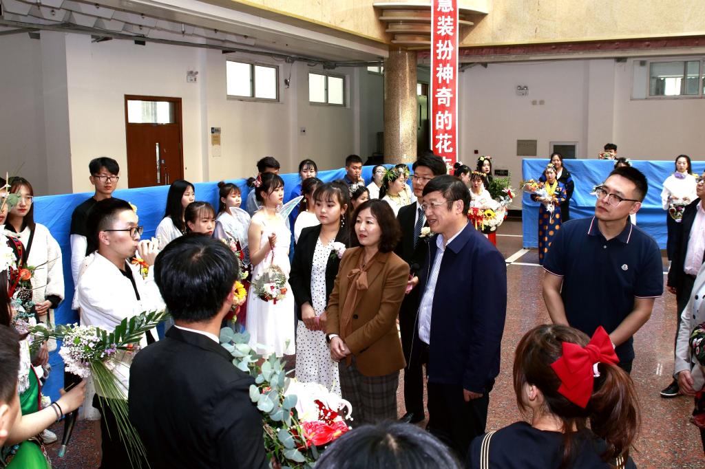 校黨委副書記齊宏偉、張文治,副校長李英杰出席大賽開幕式,并在相關(guān)部門和學(xué)院領(lǐng)導(dǎo)的陪同下一起觀看了展出作品,聽取了參賽師生關(guān)于插花作品創(chuàng)意的說明。
