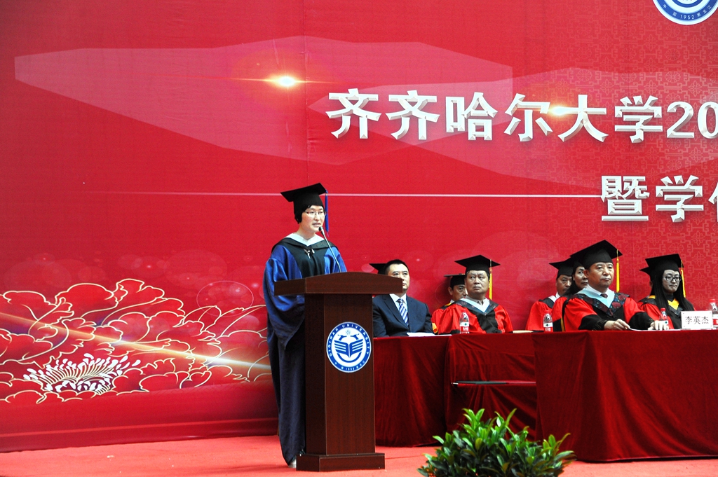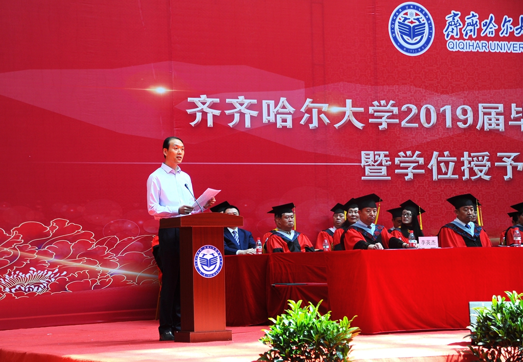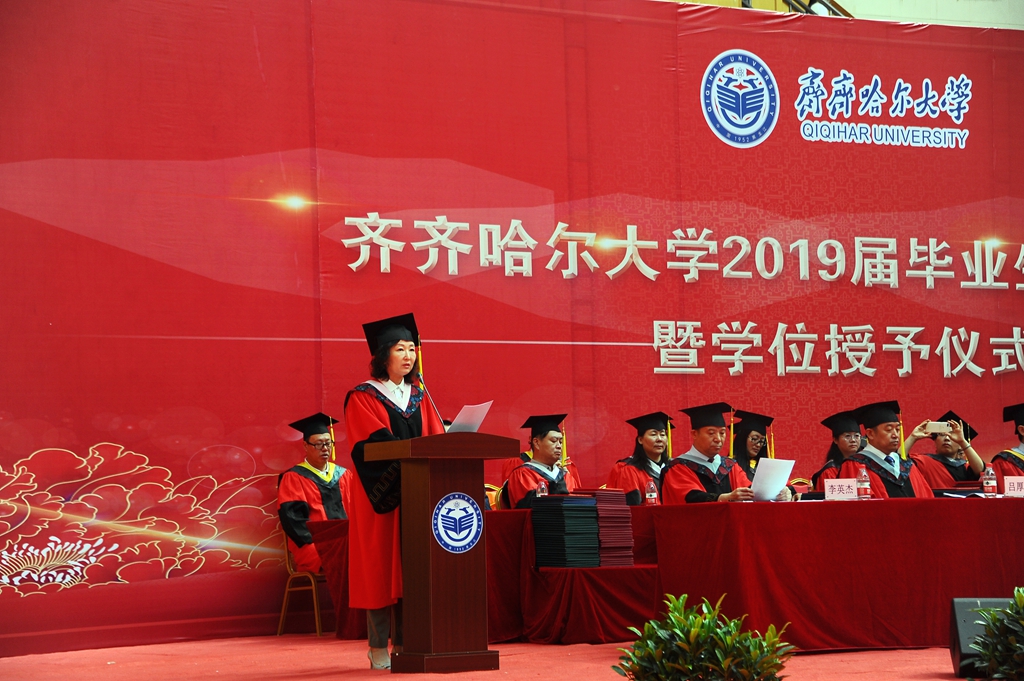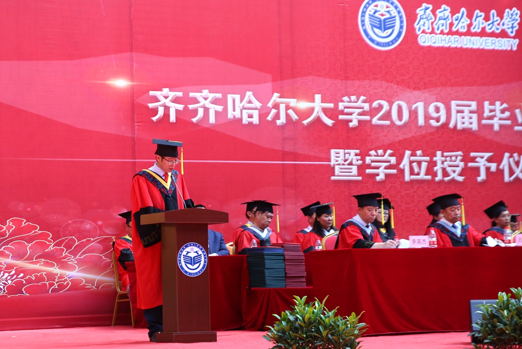 副校長(zhǎng)張樹(shù)軍宣讀齊齊哈爾大學(xué)《關(guān)于授予本科生、研究生、留學(xué)生學(xué)位的決定》。