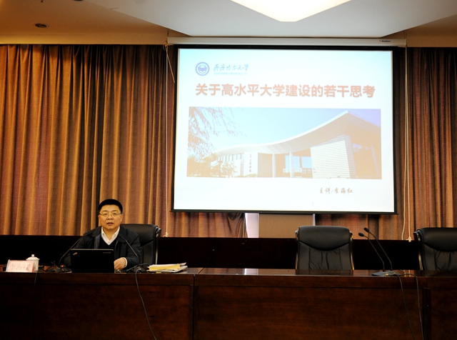 3月18日下午,校黨委書記李海紅在處級干部培訓班上以《高水平大學建設(shè)的若干思考》為題作了專題輔導報告。他指出,自2008年黑龍江省實施“高教強省”戰(zhàn)略以來,我校被列入10所重點建設(shè)的高水平大學行列,全校上下按照建設(shè)方案,堅持“質(zhì)量立校、人才強校、特色興校、文化鑄?!钡陌l(fā)展理念,堅持以立德樹人為根本任務(wù),全面推進有特色高水平教學研究型綜合大學建設(shè),努力把中央和省委的重大部署轉(zhuǎn)化為加快建成有特色高水平大學的生動實踐,奮力把學習黨的創(chuàng)新理論成果轉(zhuǎn)化為推動學校科學發(fā)展的強大動力、創(chuàng)新舉措和實際效果,有效履行現(xiàn)代大學肩負的人才培養(yǎng)、科學研究、服務(wù)社會、文化傳承與創(chuàng)新的職能,取得了喜人成就。