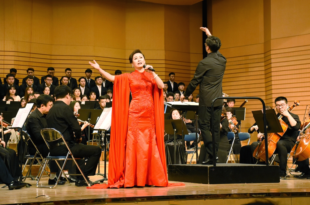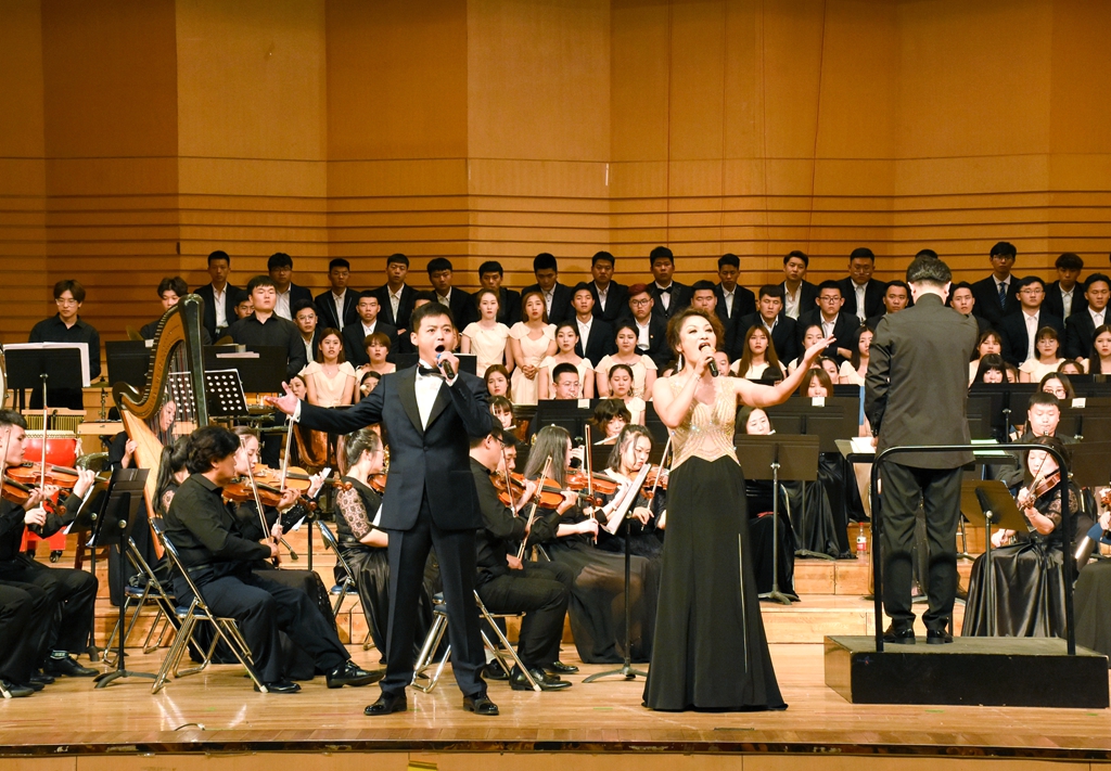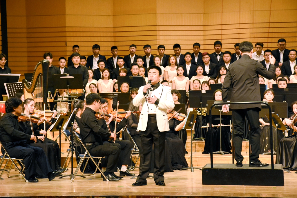 音樂會在快閃《我和我的祖國》中拉開序幕,交響序曲《紅旗頌》、男聲獨唱《把一切獻給黨》、男女生二重唱《國旗在訴說》、獨唱《親吻祖國》,樂曲氣概豪邁,全面展現(xiàn)了中國人民在中國共產(chǎn)黨的領(lǐng)導(dǎo)下,英勇奮斗、披荊斬棘的光輝歷程;二胡與樂隊《贊歌》、管弦樂《熱巴舞曲》民族特色鮮明,表現(xiàn)力張弛有度,聽得觀眾如癡如醉;《江橋組曲》第四樂章——黎明之光,以管弦樂這種音樂表現(xiàn)方式譜寫出龍江大地感天動地、氣壯山河的抗戰(zhàn)英雄史詩;男女生四重唱《不忘初心》、鋼琴協(xié)奏曲《黃河》第四樂章、管弦樂《我的祖國》等樂曲或優(yōu)美、或雄壯,表達了人民對中國共產(chǎn)黨的無限熱愛和對美好生活的執(zhí)著追求,將整場音樂會推向了高潮。