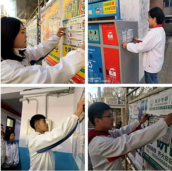 各學(xué)院志愿者在校園內(nèi)寢室樓、及校園宣傳欄張貼垃圾分類宣傳海報(bào),發(fā)放垃圾分類宣傳單。