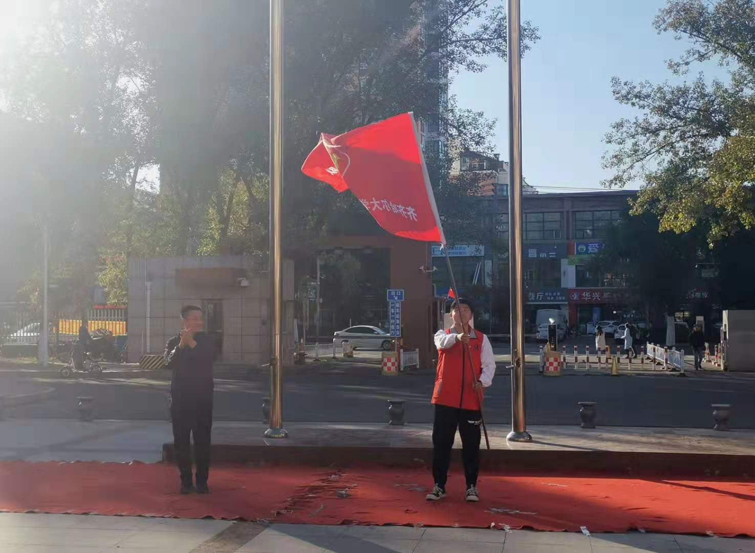 校團(tuán)委書記孫大鵬為護(hù)河志愿服務(wù)隊(duì)授旗,青年志愿者張金源代表護(hù)河志愿服務(wù)隊(duì)接旗。
