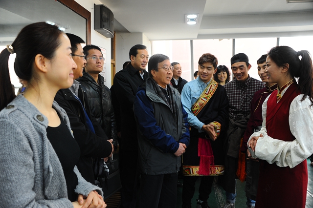在音樂與舞蹈學(xué)院,調(diào)研組一行實地考察了我校民族音樂與舞蹈教育教學(xué)工作,并同學(xué)院領(lǐng)導(dǎo)、在場師生進(jìn)行了交流和會談。國家民委專職委員管培俊、國家民委教科司司長田聯(lián)剛等領(lǐng)導(dǎo)還同我校來自西藏自治區(qū)的同學(xué)進(jìn)行了交流。