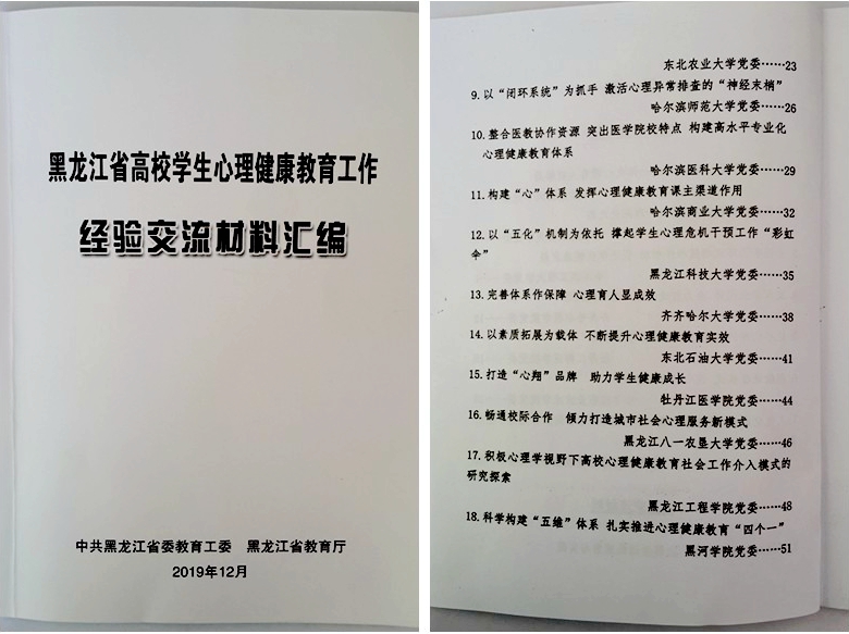 會上,黑龍江大學、哈爾濱工業(yè)大學、哈爾濱工程大學、齊齊哈爾醫(yī)學院、牡丹江師范學院、哈爾濱職業(yè)技術(shù)學院、黑龍江生態(tài)工程職業(yè)技術(shù)學院7所高校黨委做了高校心理健康教育工作經(jīng)驗交流發(fā)言,我校心理健康教育工作總結(jié)被收錄全省心理健康教育工作經(jīng)驗交流材料匯編進行書面交流。
