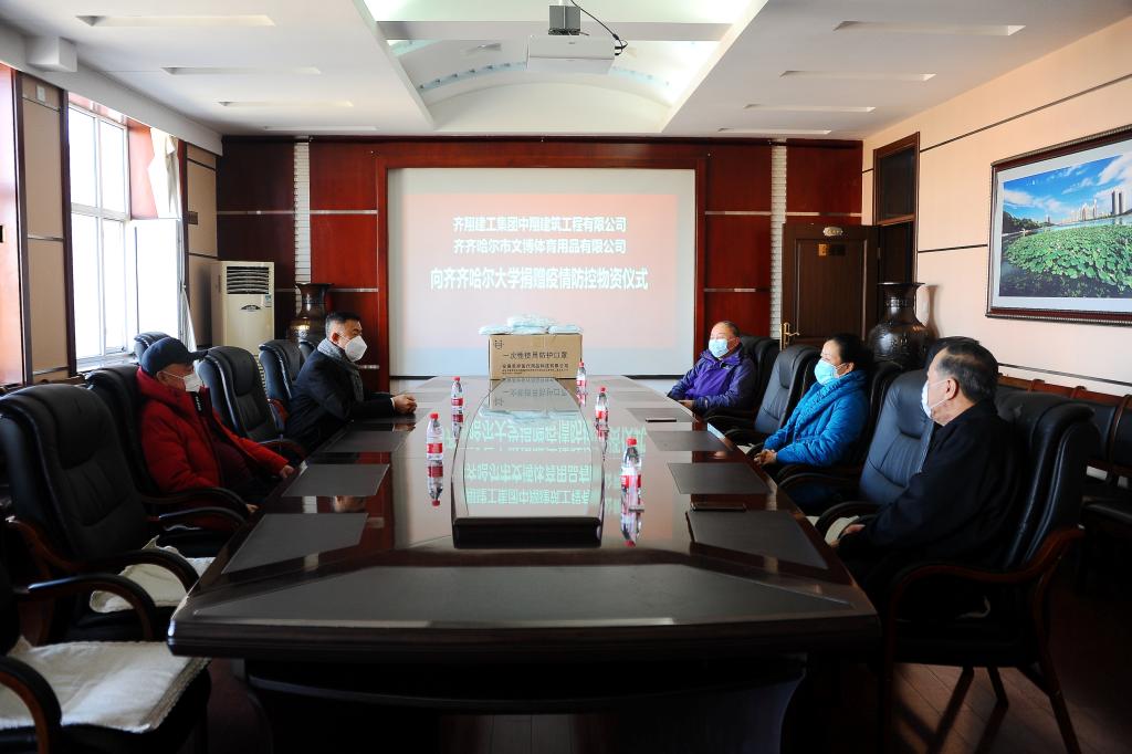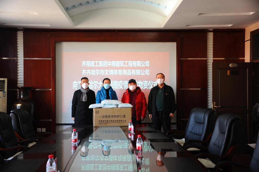 姚濱、羅文章在捐贈儀式上分別介紹了齊翔建工集團(tuán)中翔建筑有限公司、文博體育用品有限公司的基本情況,并表示作為地方企業(yè)將持續(xù)關(guān)注和支持齊齊哈爾大學(xué)的疫情防控工作,此次捐贈防疫物資,既表達(dá)對堅(jiān)守在防控疫情一線的學(xué)校醫(yī)護(hù)人員及工作人員的敬意和支持,也祝愿齊大師生保重身體,眾志成城,共同打贏疫情防控阻擊戰(zhàn)。