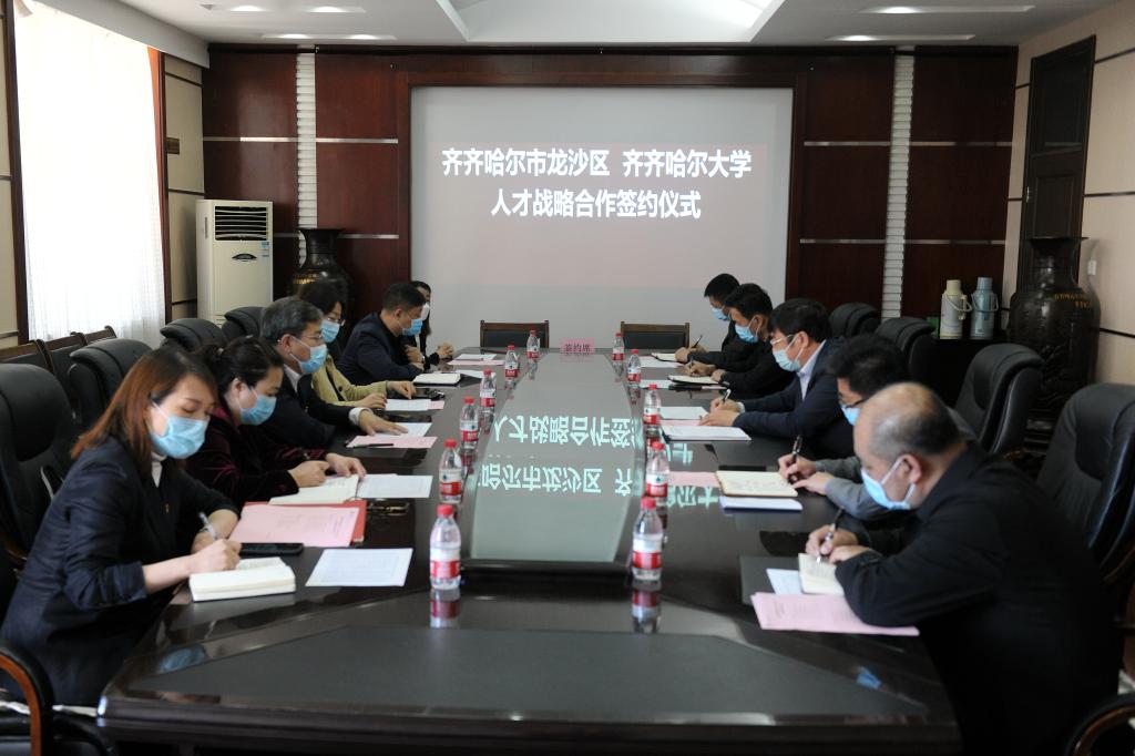 (張文治、劉勇分別代表學(xué)校、龍沙區(qū)委簽署人才戰(zhàn)略合作協(xié)議。)