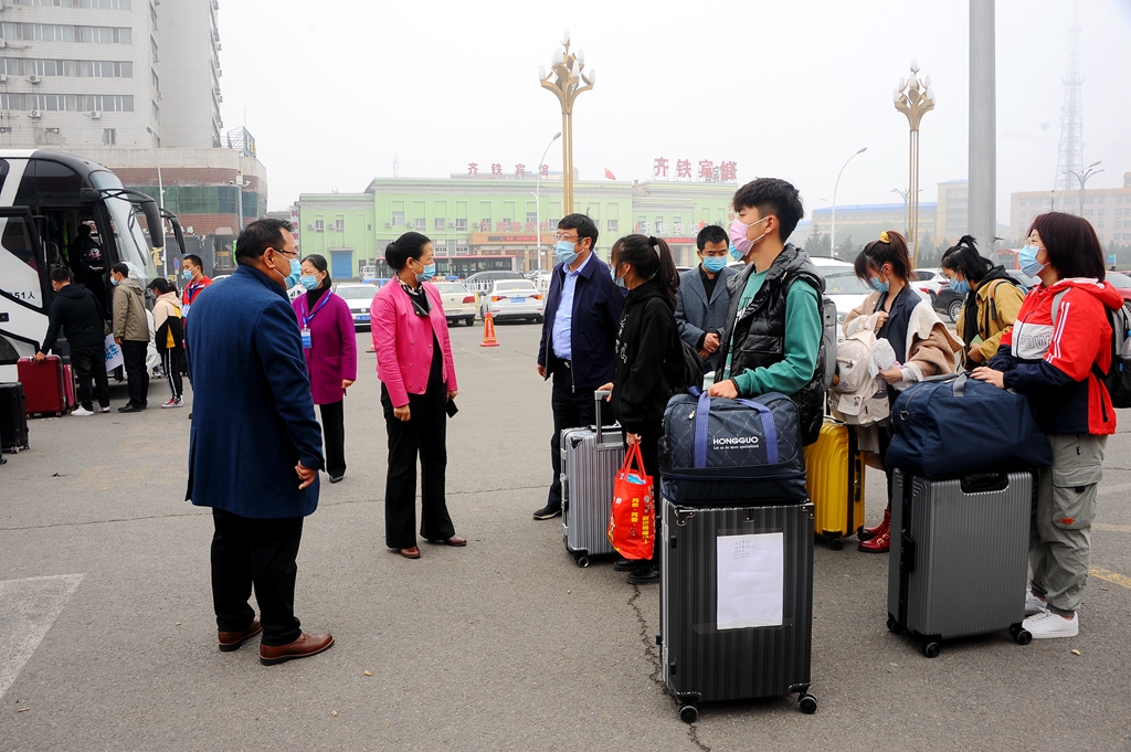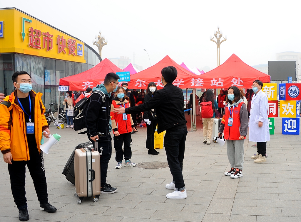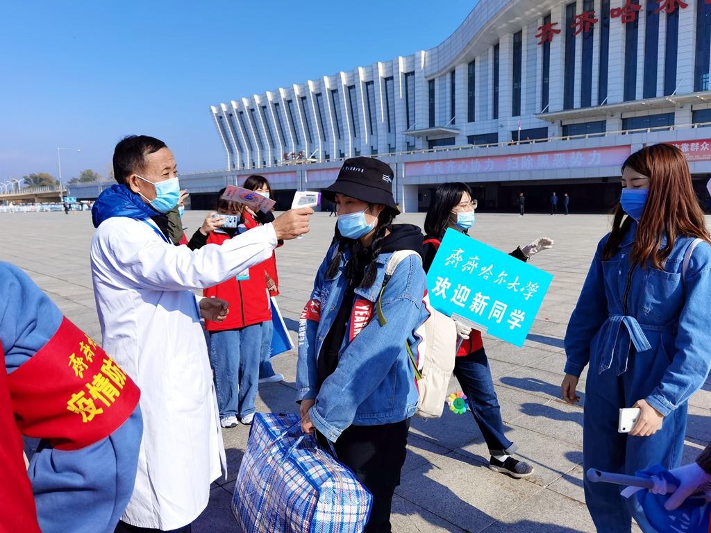 學校在齊齊哈爾火車站、齊齊哈爾火車南站、三百客運樞紐站、站前長途客運站和齊齊哈爾機場組織了集中接站,現(xiàn)場工作的有關(guān)領(lǐng)導(dǎo)、老師、學生志愿者們打著引導(dǎo)牌、揮舞著旗幟,積極有序地迎接剛剛走下火車的新生同學及家長,組織大家及時坐上接站班車,順利抵達學校。學生和家長出站后嚴格執(zhí)行“戴口罩、測溫、掃碼”措施,通過“通信大數(shù)據(jù)行程卡”核查行動軌跡,無異常情況的同學集體乘車到校直接進入校園;家長由學校專門安排的專車接送到校,為保障校園防疫安全,彌補新生家長不能進入校園的遺憾,學校為新生家長準備了專門的校園觀光車,讓家長在車內(nèi)瀏覽校園。