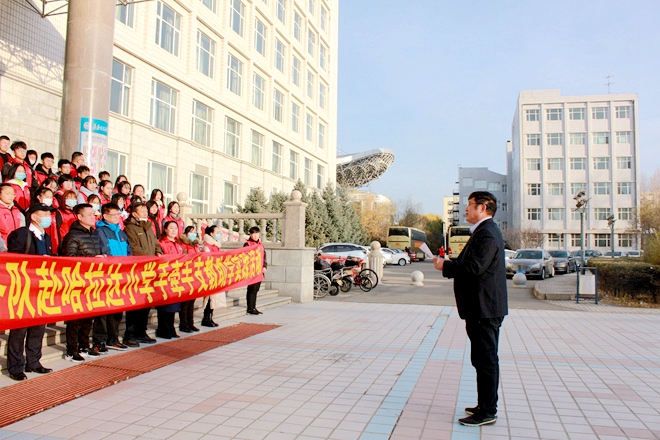 黨委常委、宣傳部部長(zhǎng)王曉梅為志愿服務(wù)隊(duì)授旗。