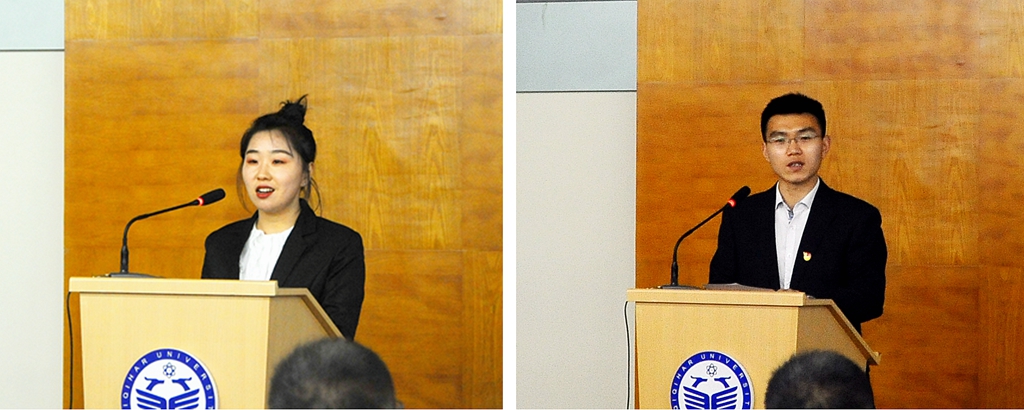 2020年度學生課外學術(shù)競賽活動先進個人、美術(shù)與藝術(shù)設(shè)計學院劉春雨代表全體獲獎學生發(fā)言;2020年度學生課外學術(shù)競賽活動優(yōu)秀指導(dǎo)教師、馬克思主義學院郭雪冬代表全體指導(dǎo)教師發(fā)言。