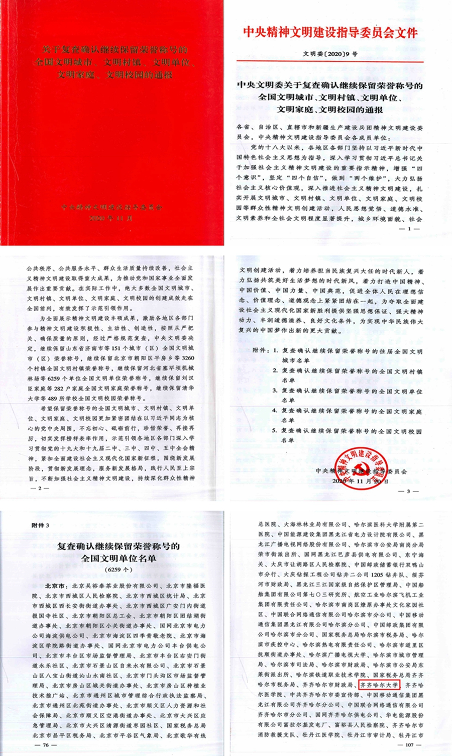 日前,中央精神文明建設(shè)指導(dǎo)委員會(huì)印發(fā)了《關(guān)于復(fù)查確認(rèn)繼續(xù)保留榮譽(yù)稱號(hào)的全國(guó)文明城市、文明村鎮(zhèn)、文明單位、文明家庭、文明校園的通報(bào)》,齊齊哈爾大學(xué)名列其中。我校自2011年被評(píng)為全國(guó)文明單位,10年來(lái)一直保持此項(xiàng)殊榮。