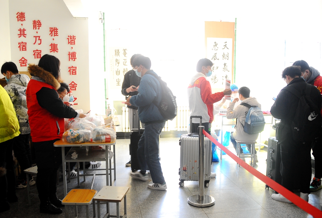 在2021年春季學(xué)期學(xué)生返校工作中,學(xué)校認(rèn)真貫徹上級和屬地防控要求,高度重視,未雨綢繆,在“早、嚴(yán)、精、實(shí)”四個方面下功夫,在防疫中開學(xué),在開學(xué)中防疫,確保安全開學(xué)、健康開學(xué)。返校前,同學(xué)們需要完成不少于14天的健康打卡,做好健康監(jiān)測,上報(bào)返校前14天身體健康狀況和行程軌跡,并通過完美校園APP提出健康報(bào)到申請,經(jīng)審核批準(zhǔn)后,上報(bào)返校行程信息,分批在指定日期進(jìn)入校園。入校時,嚴(yán)格執(zhí)行“掃碼、測溫、戴口罩”措施,生成完美校園健康出入證、龍江健康碼為綠碼、測溫正常方可入校,回到本人所在公寓樓附近完成核酸檢測采樣。持“返校信息卡”進(jìn)入學(xué)生所在公寓樓,等待核酸檢測結(jié)果。學(xué)校還為每名同學(xué)貼心準(zhǔn)備了一份“防疫包”、一份“餐包”以及一份晚餐盒飯。