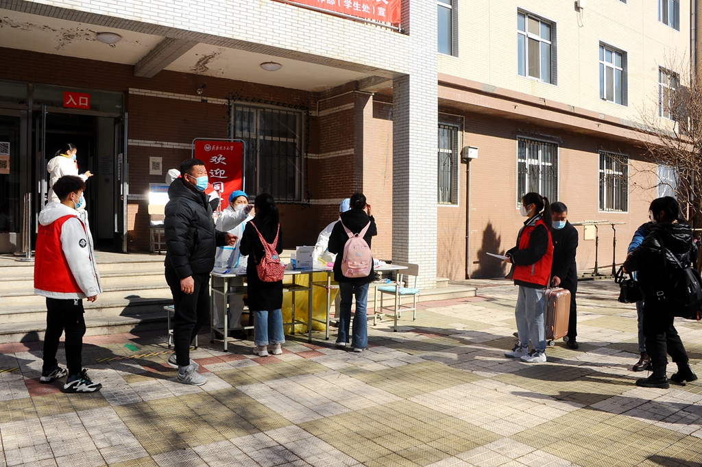 初春的校園,乍暖還寒,工作人員和志愿者們積極為返校學(xué)生查驗完美校園健康出入證和龍江健康碼、測量體溫、行李消毒,同學(xué)們進入校園后直接返回所在公寓樓附近完成核酸檢測采樣,檢測結(jié)果為陰性的同學(xué)方可有序活動。