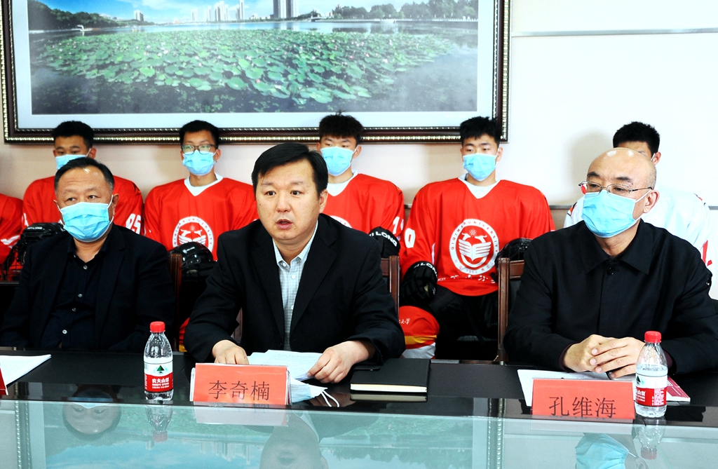 李奇楠在講話時(shí)代表學(xué)校對(duì)各位嘉賓的到來(lái)表示熱烈歡迎,對(duì)齊齊哈爾市杭奧電梯有限公司贊助我校冰球隊(duì)表示衷心的感謝,對(duì)齊齊哈爾大學(xué)“杭奧電梯”男子冰球隊(duì)成立表示熱烈的祝賀,并對(duì)我校的基本概況、學(xué)科專業(yè)設(shè)置、冰雪體育教育等情況進(jìn)行了介紹。他指出,學(xué)校作為冰雪體育科技聯(lián)盟理事單位和齊齊哈爾市社會(huì)科學(xué)冰雪研究基地,始終堅(jiān)持發(fā)展冰雪體育運(yùn)動(dòng),引領(lǐng)區(qū)域體育風(fēng)尚。我們將以此次“杭奧電梯”男子冰球隊(duì)成立為契機(jī),著力深化產(chǎn)學(xué)研協(xié)同合作,從配套政策、經(jīng)費(fèi)投入、科研條件、人才培養(yǎng)等方面全力支持,促進(jìn)政校企全方位、多層次、寬領(lǐng)域的交流合作,希望我們未來(lái)的合作將結(jié)出更加豐碩的成果,共創(chuàng)齊齊哈爾市杭奧電梯有限公司和齊齊哈爾大學(xué)更加美好的明天。