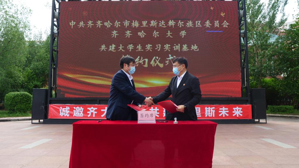 宣講招聘會(huì)上,張文治與郝憲慶代表校區(qū)雙方共同簽署了《共建大學(xué)生實(shí)習(xí)實(shí)訓(xùn)基地框架協(xié)議》,雙方將按照平等互利、真誠(chéng)合作、優(yōu)勢(shì)互補(bǔ)、共同發(fā)展的原則,積極開展校地合作,為更多環(huán)湖大學(xué)優(yōu)秀畢業(yè)生搭建融入鄉(xiāng)村振興事業(yè)的平臺(tái),為梅里斯區(qū)振興發(fā)展厚植人才保障。