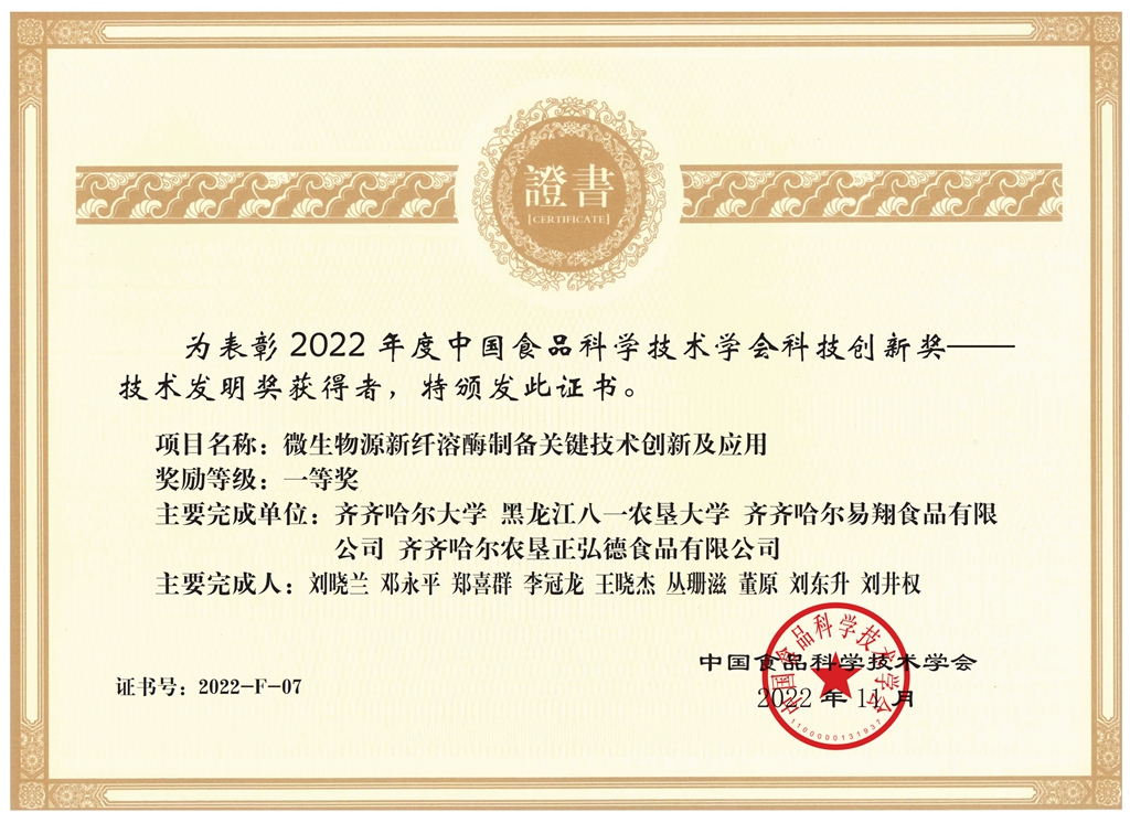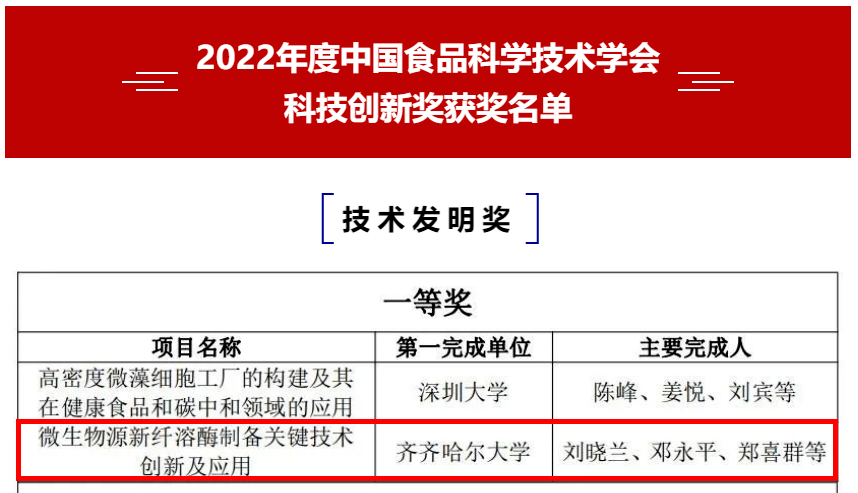 12月14日,中國食品科學(xué)技術(shù)學(xué)會第十九屆年會隆重舉行頒獎儀式,我校劉曉蘭教授團隊的科技成果“微生物源新纖溶酶制備關(guān)鍵技術(shù)創(chuàng)新及應(yīng)用”獲得科技創(chuàng)新獎技術(shù)發(fā)明獎一等獎,這是我校專家首次獲此殊榮。
