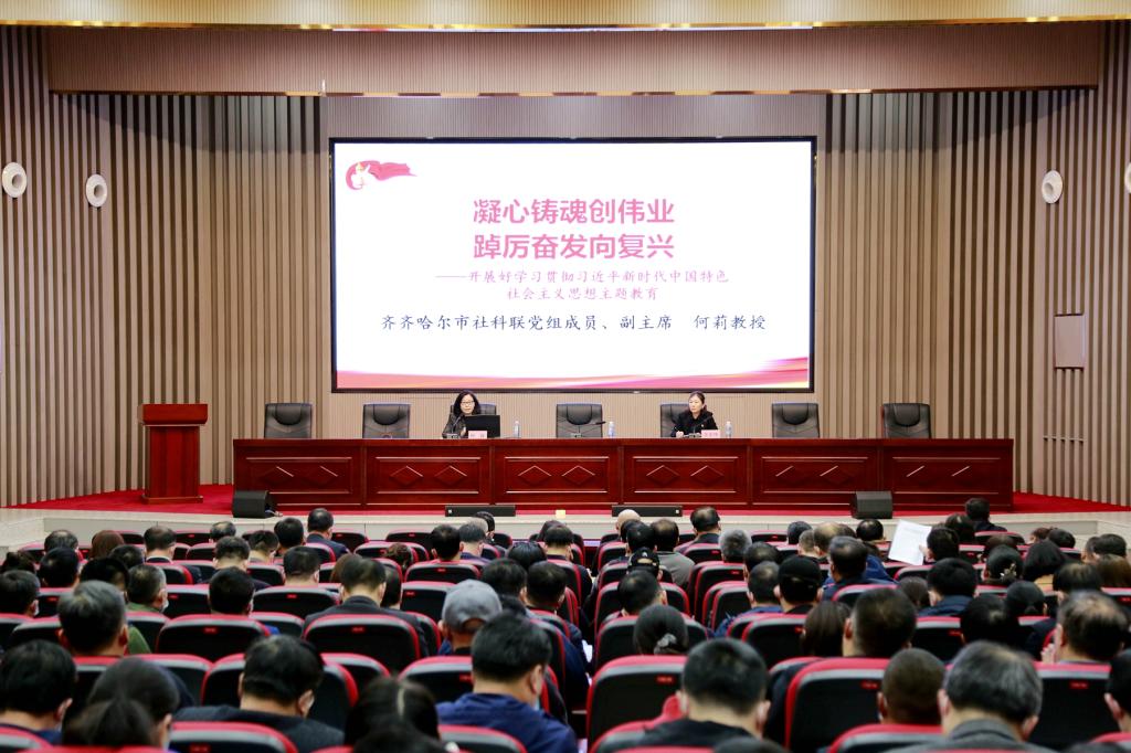 開班式后,齊齊哈爾市社科聯(lián)黨組成員、副主席何莉教授以《凝心鑄魂創(chuàng)偉業(yè)踔厲奮發(fā)向復(fù)興—開展好學(xué)習(xí)貫徹習(xí)近平新時(shí)代中國特色社會(huì)主義思想主題教育》為題為全校副處級以上領(lǐng)導(dǎo)干部作了專題講座。