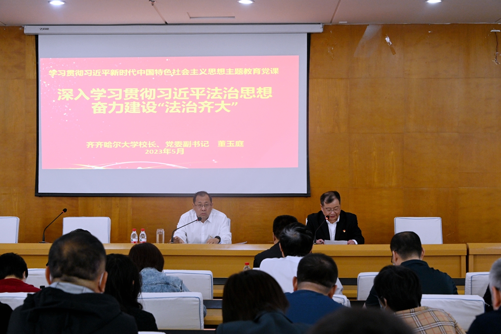 董玉庭以《深入學(xué)習(xí)貫徹習(xí)近平法治思想奮力建設(shè)“法治齊大”》為題,從習(xí)近平法治思想的重大意義、習(xí)近平法治思想的真理特質(zhì)、習(xí)近平法治思想是依法治校工作的理論指引、以習(xí)近平法治思想為指引,全面推進(jìn)依法治校進(jìn)程等四個(gè)方面進(jìn)行了闡發(fā)。他指出,現(xiàn)階段,我們學(xué)校正處在建設(shè)有特色高水平應(yīng)用型綜合大學(xué)的改革攻堅(jiān)期,必須以法治建設(shè)保障高質(zhì)量發(fā)展。要完善中國特色社會(huì)主義大學(xué)制度體系,統(tǒng)籌制度的立改廢釋工作,抓住制度質(zhì)量這個(gè)關(guān)鍵,貫徹科學(xué)立法、民主立法精神,加強(qiáng)重點(diǎn)領(lǐng)域的制度建設(shè),堅(jiān)持建章立制與改革決策同步,完善決策管理和監(jiān)督機(jī)制;要強(qiáng)化規(guī)章制度實(shí)施,把全面貫徹實(shí)施大學(xué)章程提高到一個(gè)新水平;要加快建設(shè)法治型班子,健全依法決策機(jī)制,依法履職盡責(zé),加強(qiáng)工作制度化規(guī)范化;要依法治理校務(wù),讓尊法、信法、守法、用法、護(hù)法成為全體齊大人的共同追求,全員自覺守法;要加強(qiáng)權(quán)力制約和監(jiān)督,用制度管權(quán)管人管事,依法設(shè)定權(quán)力、規(guī)范權(quán)力、制約權(quán)力、監(jiān)督權(quán)力,將權(quán)力關(guān)在制度的籠子里;要提高領(lǐng)導(dǎo)干部運(yùn)用法治的思維和能力,帶頭依法辦事,培養(yǎng)法治思維,堅(jiān)守教育公正,構(gòu)建以權(quán)利公平、機(jī)會(huì)公平、規(guī)則公平為核心的校園公平機(jī)制,在各項(xiàng)工作中優(yōu)先考量師生權(quán)益,為教師發(fā)展和學(xué)生健康成長提供法治保障。