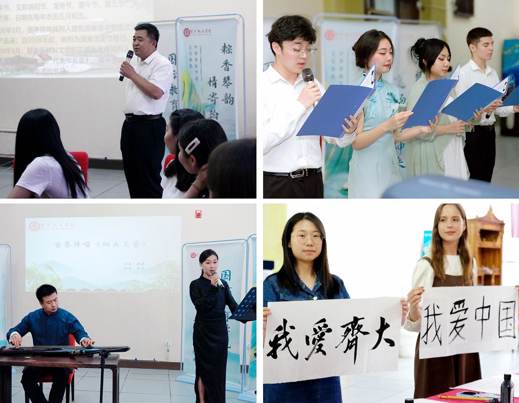活動中,訾希坤老師向師生們介紹了端午節(jié)的起源和意義,留學(xué)生與中國學(xué)生分別用中英文朗誦了千年經(jīng)典《離騷》,市青年藝術(shù)家崔爽、魏巍為大家?guī)砹斯徘購棾蛾栮P(guān)三疊》,并與留學(xué)生互動實踐,撥動琴弦感受千年古琴文化的韻味。中外學(xué)生代表現(xiàn)場進(jìn)行了書法展示,進(jìn)一步感知中國文化、書寫中國情緣。
