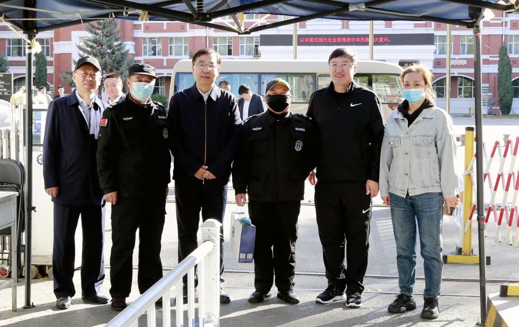 郝文斌一行先后來到中區(qū)大門、辦公樓門衛(wèi)室、??傊蛋嗍?、校110服務(wù)中心、中區(qū)綜合泵房、守正樓門衛(wèi)室、南校區(qū)大學(xué)生科技園、西二區(qū)變電所、學(xué)生公寓8號樓等地,現(xiàn)場檢查了假期校園安全管控情況,代表學(xué)校為堅守崗位的一線教職員工代表送去了慰問品,向他們的辛勤勞動致敬,并對相關(guān)部門進(jìn)一步做好校園安全及后勤保障工作提出了希望和要求。