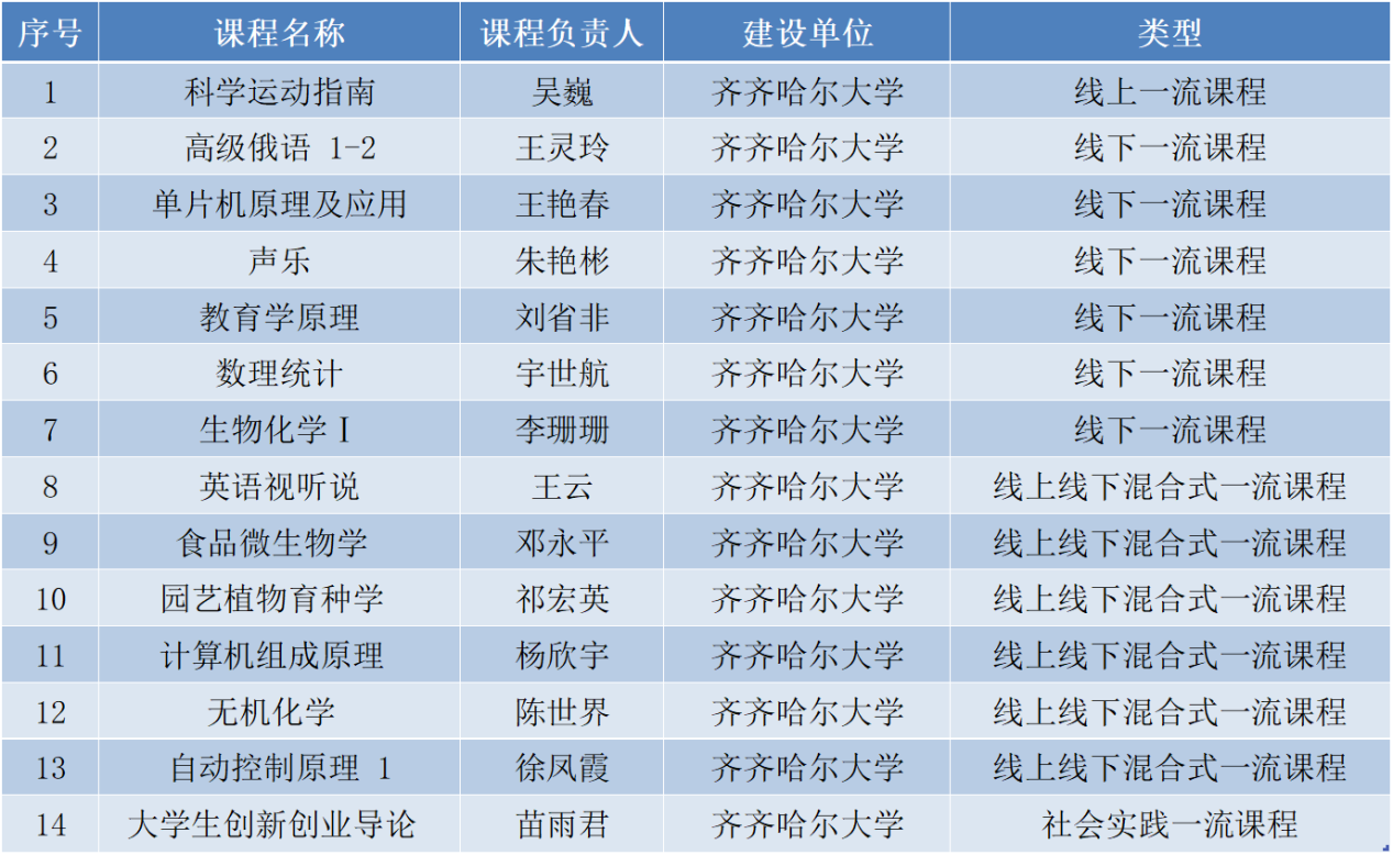近日,黑龍江省教育廳公示了第三批省級一流本科課程認定結果,我校14門課程被認定為第三批省級一流本科課程,其中線上課程1門,線下課程6門,線上線下混合式課程6門,社會實踐課程1門。截至目前,學校共獲批省級一流本科課程38門,其中9門于今年4月獲批國家級一流本科課程。