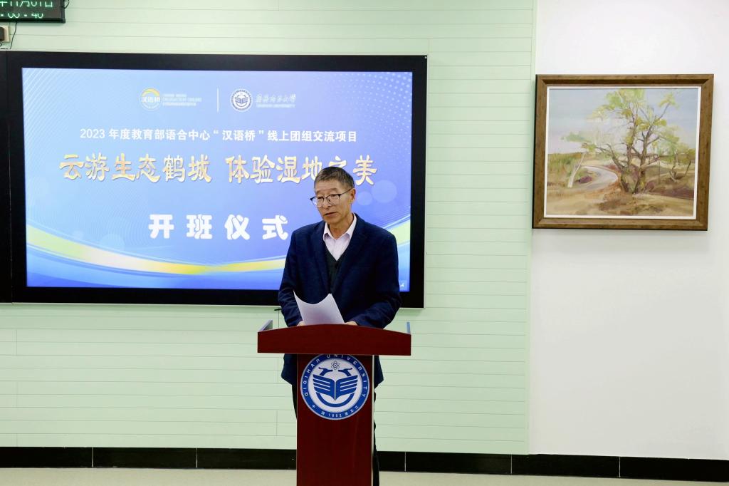 張樹軍在致辭中向教育部語合中心及黑龍江省教育廳國際合作與交流處再次為我校提供文化交流的機會表示感謝。同時希望通過開展此次項目使更多學員領(lǐng)略鶴城地域文化的深厚底蘊,加強對中國生態(tài)文明建設(shè)成效的認識,推動文化合作交流,促進國際中文教育發(fā)展和中外人文交流互鑒。