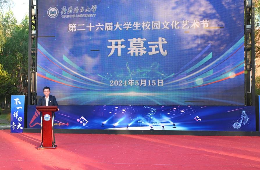 張文治在致開幕辭時(shí)表示,我校歷來高度重視大學(xué)文化建設(shè)和藝術(shù)教育工作,一年一度的校園文化藝術(shù)節(jié)已成為我校文化建設(shè)和藝術(shù)教育成果的展示盛會(huì)。本屆校園文化藝術(shù)節(jié)以“不一樣的齊大 更有Young的青春”為主題,將舉辦一系列集思想性、藝術(shù)性于一體的校級(jí)品牌活動(dòng)、院級(jí)特色活動(dòng)和群眾性學(xué)生社團(tuán)活動(dòng)。希望廣大團(tuán)員青年深入學(xué)習(xí)習(xí)近平文化思想,堅(jiān)持文化自信自強(qiáng),廣泛踐行和培育社會(huì)主義核心價(jià)值觀,厚植愛黨愛國(guó)情懷和愛校榮校情感,用文化的力量彰顯齊大正能量,以藝術(shù)的方式傳遞齊大好聲音。相關(guān)部門和各學(xué)院要以本屆文化藝術(shù)節(jié)為契機(jī),不斷發(fā)展和創(chuàng)新思想政治教育載體,用先進(jìn)的文化引領(lǐng)和培育青年,以優(yōu)秀的藝術(shù)吸引和激勵(lì)青年,為有特色高水平應(yīng)用型綜合大學(xué)建設(shè)事業(yè)增光添彩。