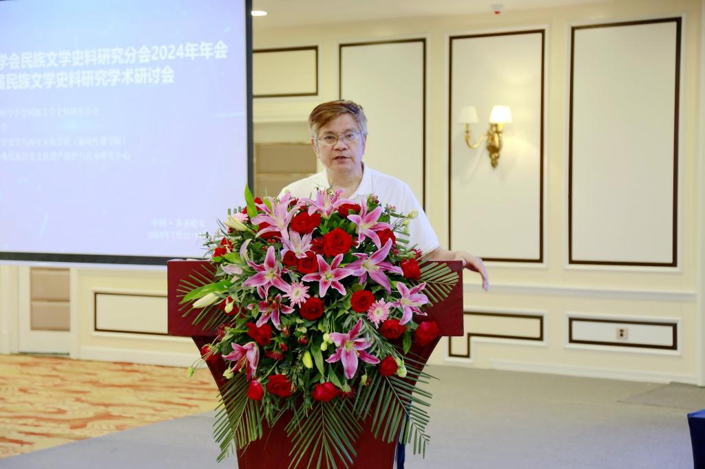 大會(huì)主旨發(fā)言環(huán)節(jié),中華文學(xué)史料學(xué)學(xué)會(huì)民族文學(xué)史料研究分會(huì)顧問(wèn)、原西南民族大學(xué)校長(zhǎng)曾明教授,大連民族大學(xué)中國(guó)少數(shù)民族文學(xué)研究所所長(zhǎng)李曉峰教授、中國(guó)社會(huì)科學(xué)院民族文學(xué)研究所吳曉東研究員和楊霞研究員、齊齊哈爾大學(xué)文學(xué)與歷史文化學(xué)院(新聞傳播學(xué)院)李秀蓮教授、西北民族大學(xué)中國(guó)語(yǔ)言文學(xué)學(xué)部多洛肯教授、內(nèi)蒙古大學(xué)文學(xué)與新聞學(xué)院院長(zhǎng)米彥青教授、四川大學(xué)文學(xué)與新聞學(xué)院陳思廣教授、西南民族大學(xué)孫紀(jì)文教授、黑龍江省達(dá)斡爾族研究會(huì)會(huì)長(zhǎng)吳煥軍等10位專家學(xué)者共同探討了少數(shù)民族文學(xué)史料研究的理論與實(shí)踐問(wèn)題。