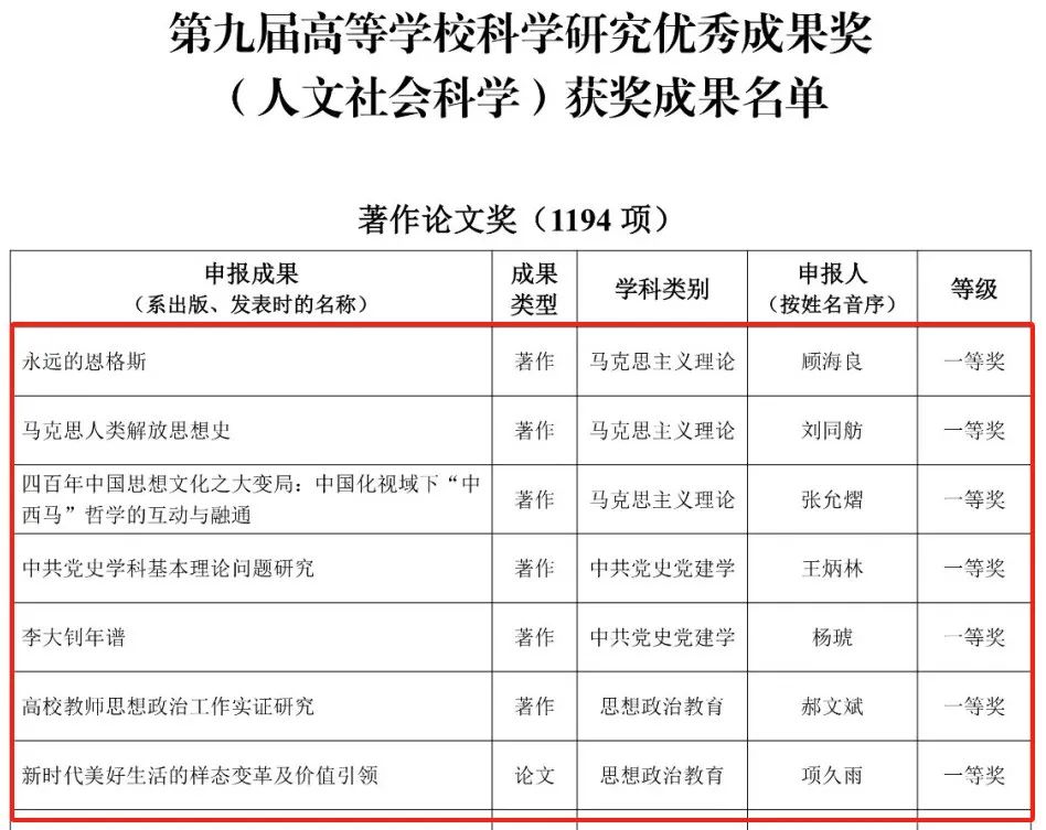 據(jù)悉,本次評(píng)選馬克思主義理論學(xué)科共有7位學(xué)者獲一等獎(jiǎng),分別為北大顧海良教授、浙大劉同舫教授、上海師大張?jiān)熟诮淌?、北師大王炳林教授、北大楊琥副研究員、齊齊哈爾大學(xué)郝文斌教授、武大項(xiàng)久雨教授。高等學(xué)??茖W(xué)研究?jī)?yōu)秀成果獎(jiǎng)(人文社會(huì)科學(xué))是我國(guó)高校哲學(xué)社會(huì)科學(xué)領(lǐng)域最高級(jí)別的政府獎(jiǎng)項(xiàng),旨在表彰高校哲學(xué)社會(huì)科學(xué)工作者取得的突出成績(jī),展示高校社科界服務(wù)黨和國(guó)家事業(yè)發(fā)展的重大理論與實(shí)踐成果,推動(dòng)高校加快構(gòu)建中國(guó)特色哲學(xué)社會(huì)科學(xué)。