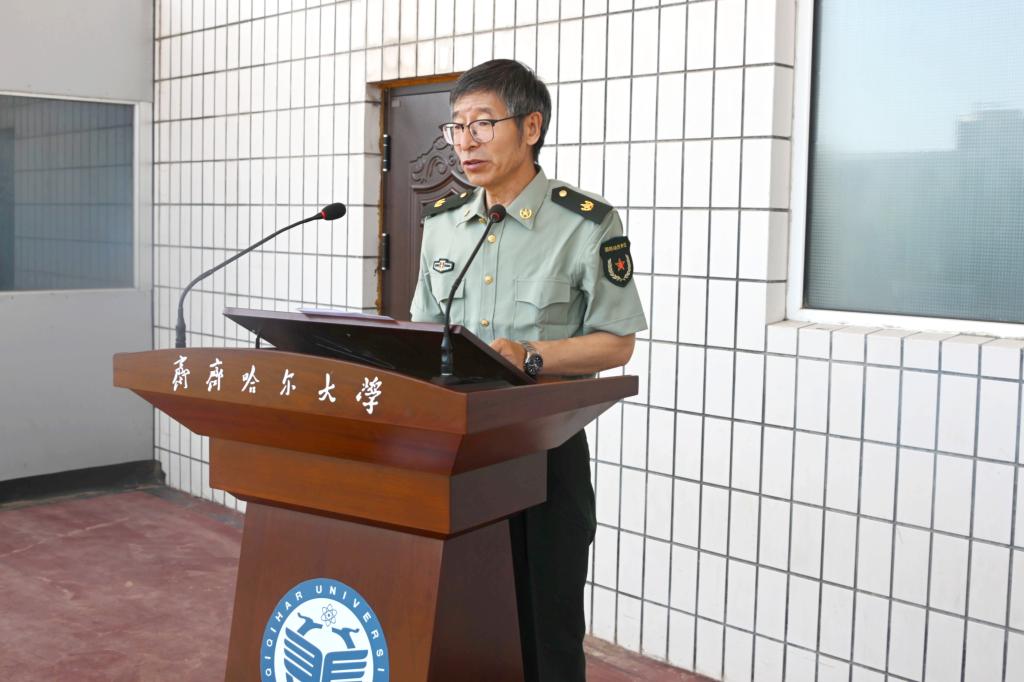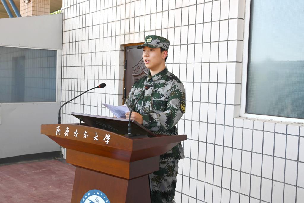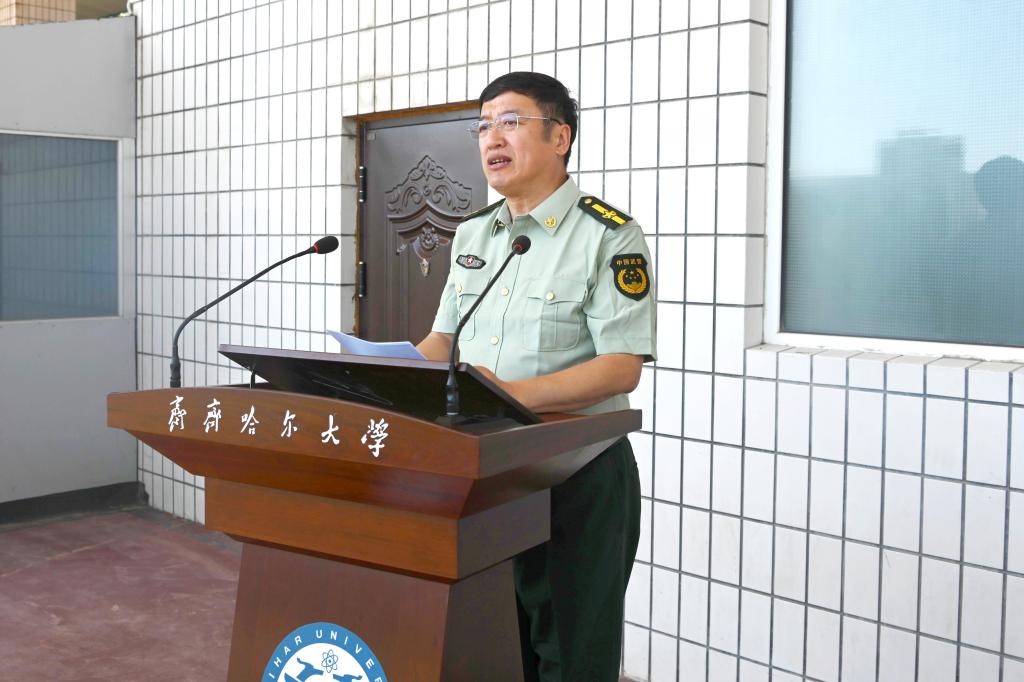 張文治作動(dòng)員講話,他向承擔(dān)本次軍訓(xùn)任務(wù)的武警齊齊哈爾支隊(duì)全體官兵表示熱烈的歡迎,向擔(dān)任軍訓(xùn)任務(wù)的40名自訓(xùn)教官表示衷心感謝,向參加軍訓(xùn)的2024級(jí)全體新同學(xué)表示誠(chéng)摯的慰問(wèn)。他強(qiáng)調(diào)了大學(xué)生軍事訓(xùn)練的重要性,指出對(duì)大學(xué)生軍事訓(xùn)練是貫徹落實(shí)《國(guó)防教育法》、《兵役法》的基本要求,是全民國(guó)防意識(shí)的重要體現(xiàn),是立德樹(shù)人的重要舉措。他向全體參訓(xùn)師生提出四點(diǎn)希望和要求,一要樹(shù)立理想堅(jiān)定信念;二要服從命令聽(tīng)從指揮;三要磨練意志鍛煉品質(zhì);四要嚴(yán)守紀(jì)律鑄就榮譽(yù);五要主動(dòng)擔(dān)當(dāng)密切協(xié)同。