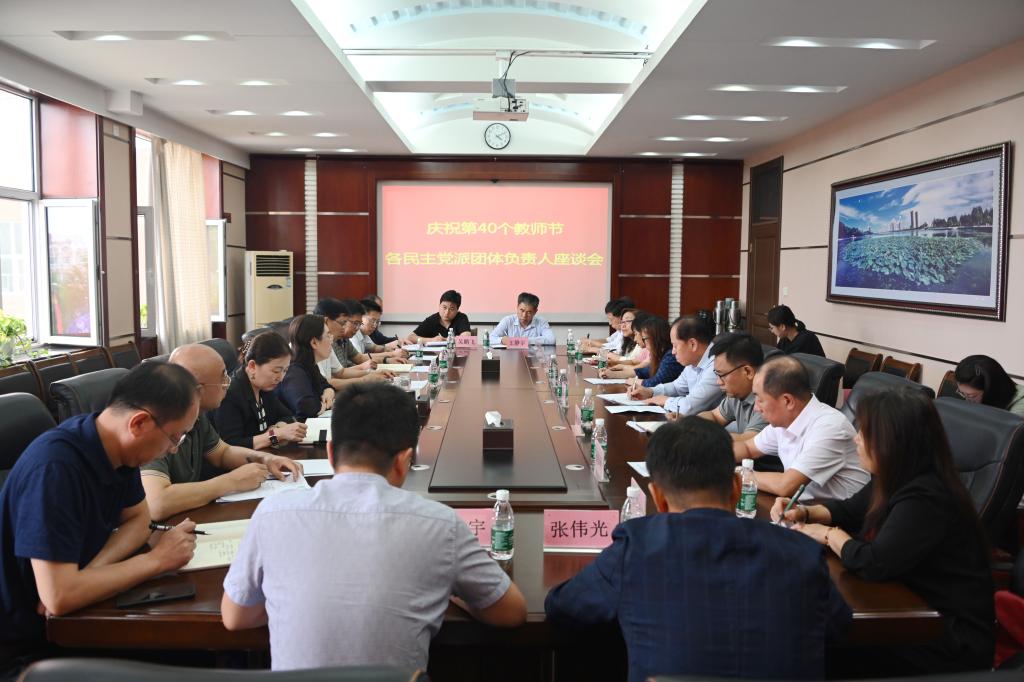 在第40個(gè)教師節(jié)來(lái)臨之際,為弘揚(yáng)教育家精神,努力營(yíng)造尊師重教濃厚氛圍,進(jìn)一步凝聚智慧力量,9月9日下午,學(xué)校在行政辦公樓504會(huì)議室召開慶祝第40個(gè)教師節(jié)各民主黨派團(tuán)體負(fù)責(zé)人座談會(huì)。校黨委書記丁宏、黨委副書記、校長(zhǎng)郝文斌、黨委副書記齊宏偉出席座談會(huì)。各民主黨派團(tuán)體負(fù)責(zé)人及黨委組織部、黨委統(tǒng)戰(zhàn)部、人事處(黨委教師工作部)、教務(wù)處、科研處等職能部門負(fù)責(zé)人參加會(huì)議,會(huì)議由齊宏偉主持。