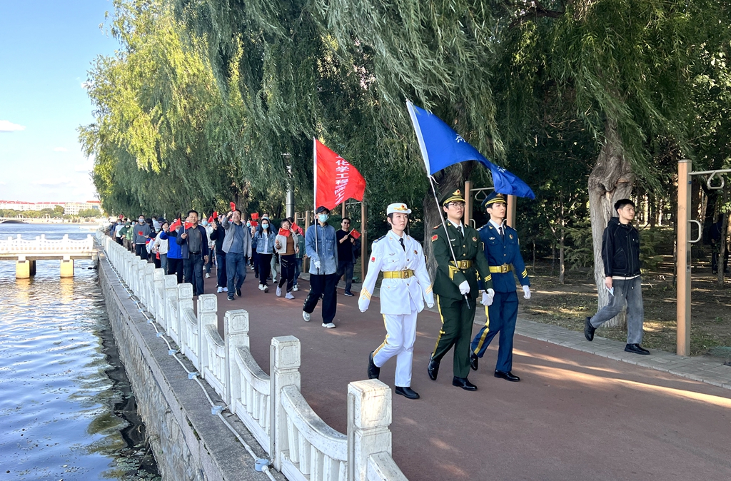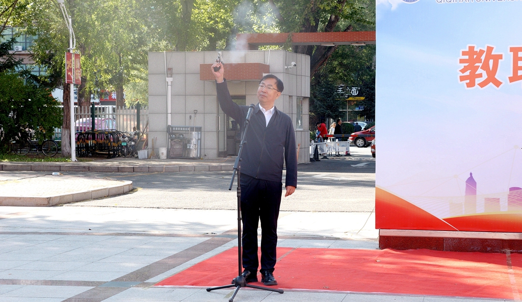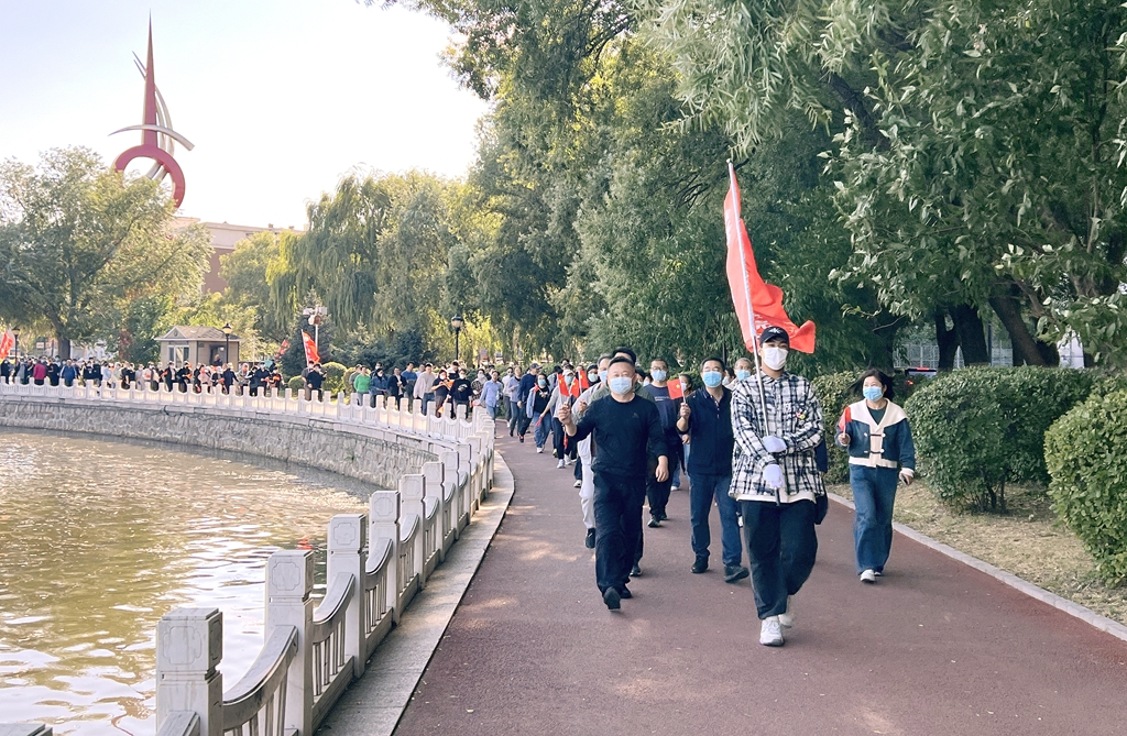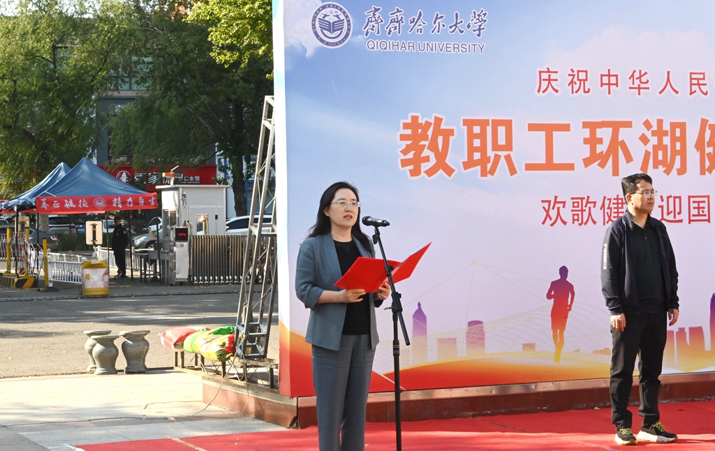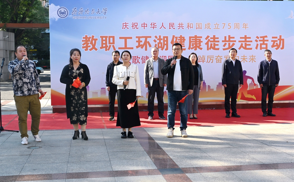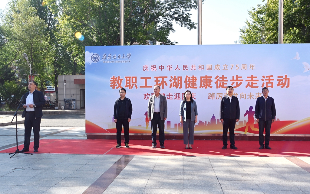 校黨委書記丁宏在致辭時(shí)指出,75年來,在中國共產(chǎn)黨的領(lǐng)導(dǎo)下,全國各族人民團(tuán)結(jié)一心、同舟共濟(jì),戰(zhàn)勝了無數(shù)艱難險(xiǎn)阻,實(shí)現(xiàn)了從站起來、富起來到強(qiáng)起來的歷史性飛躍,中國特色社會主義進(jìn)入新時(shí)代。有著72年辦學(xué)歷史的齊齊哈爾大學(xué)坐落于勞動湖畔,素有“環(huán)湖大學(xué)”的美譽(yù),這一池碧水見證了學(xué)校的發(fā)展和變遷,也為巍巍學(xué)府增添了無限的秀美與靈氣。教職工環(huán)湖健康徒步走是我校傳統(tǒng)特色體育活動,深受教職工的歡迎。希望廣大教職工在此次健步走活動中,欣賞勞動湖畔秋日的美景,感受健康運(yùn)動帶來的身心愉悅,在集體活動中增強(qiáng)凝聚力,在攜手并肩前行中增進(jìn)團(tuán)結(jié),進(jìn)一步激發(fā)愛校榮校、愛崗敬業(yè)、攻堅(jiān)奮進(jìn)的精神動力,爭做學(xué)校高質(zhì)量發(fā)展的參與者、推動者、宣傳者。