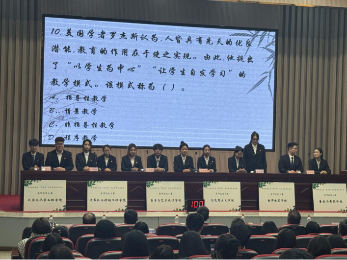 決賽分為個(gè)人三筆字書寫、板書設(shè)計(jì)、說課與講課技能比賽,學(xué)院團(tuán)體知識(shí)競(jìng)答兩個(gè)部分。經(jīng)過角逐,理學(xué)院賈國(guó)瑩獲一等獎(jiǎng),馬克思主義學(xué)院韓彤獲二等獎(jiǎng),化學(xué)與化學(xué)工程學(xué)院徐陽陽獲三等獎(jiǎng),其余6名同學(xué)獲優(yōu)秀獎(jiǎng);教師教育學(xué)院獲團(tuán)體一等獎(jiǎng),美術(shù)與藝術(shù)設(shè)計(jì)學(xué)院獲團(tuán)體二等獎(jiǎng),化學(xué)與化學(xué)工程學(xué)院獲團(tuán)體三等獎(jiǎng),馬克思主義學(xué)院、計(jì)算機(jī)與控制工程學(xué)院、音樂與舞蹈學(xué)院獲團(tuán)體優(yōu)秀獎(jiǎng),9名指導(dǎo)教師獲“優(yōu)秀指導(dǎo)教師”獎(jiǎng)。