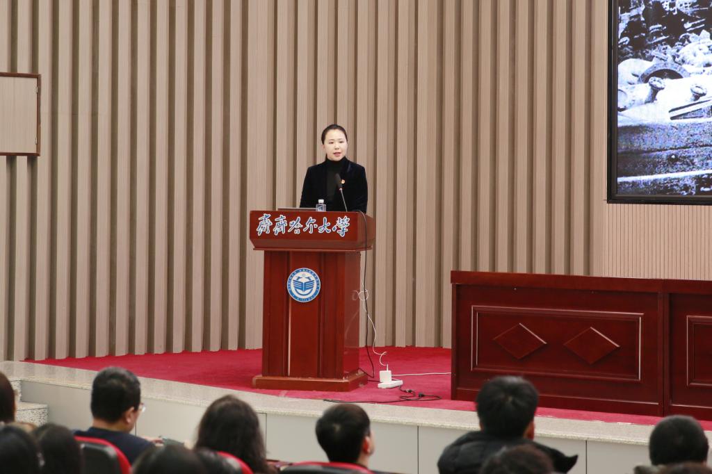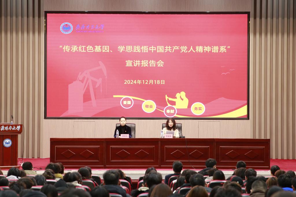 宣講報告會由全國高?!爸袊伯a(chǎn)黨人精神譜系”宣講團成員、全國紅色旅游五好講解員、石油魂宣講團首席宣講員、鐵人王進喜紀(jì)念館宣教部主任鄭媛元主講。她以《石油魂——石油精神和大慶精神、鐵人精神》為題,通過大量的歷史圖片、珍貴的影像資料和生動的語言,詳細講述了大慶石油會戰(zhàn)的整個過程以及在這個過程中形成的大慶精神、鐵人精神,深入分析了大慶精神、鐵人精神的豐富內(nèi)涵和時代價值,科學(xué)闡述了在新時代新征程傳承弘揚大慶精神、鐵人精神的實踐路徑。宣講報告內(nèi)容豐富、例證詳實,既有理論闡釋、又有感人事跡,既有思想深度、又有教育溫度,對全校廣大黨員、干部、師生更好地傳承紅色基因、賡續(xù)紅色血脈具有很強的指導(dǎo)性和啟發(fā)性。