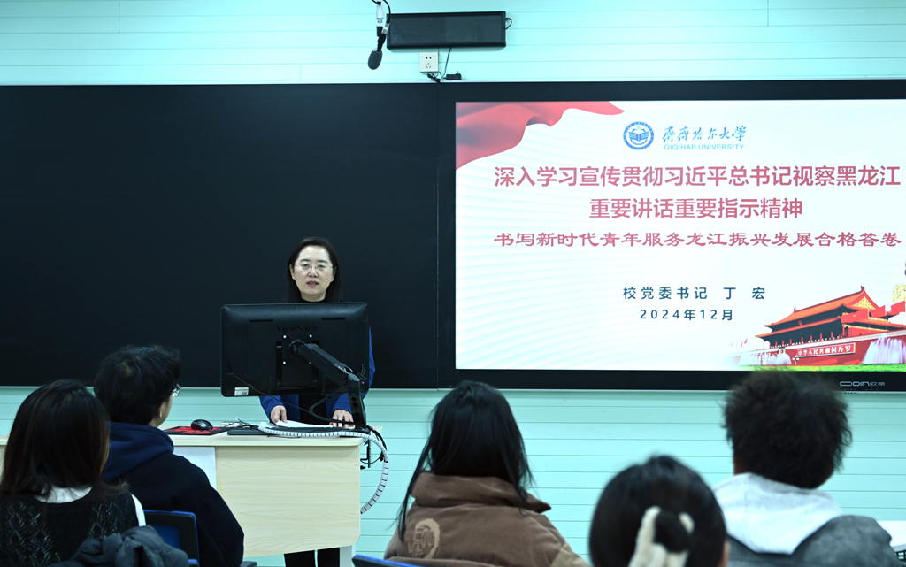 丁宏以習近平總書記在黨的十八大以來3次到我省調研考察為切入點,帶領學生深切體悟習近平總書記對我省的殷切囑托,通過分析哈爾濱蓬勃發(fā)展的特色旅游,讓同學們感受我省發(fā)展成就。她結合自身從事學生工作的經(jīng)驗勉勵學生:一要做堅定不移聽黨話、跟黨走,旗幟鮮明講政治的新時代好青年。二要砥礪人生品德,做嚴于律己、明德修身的新時代有用人才。三要錘煉過硬本領,做勤學善思,勵志篤行的新時代齊大學子。