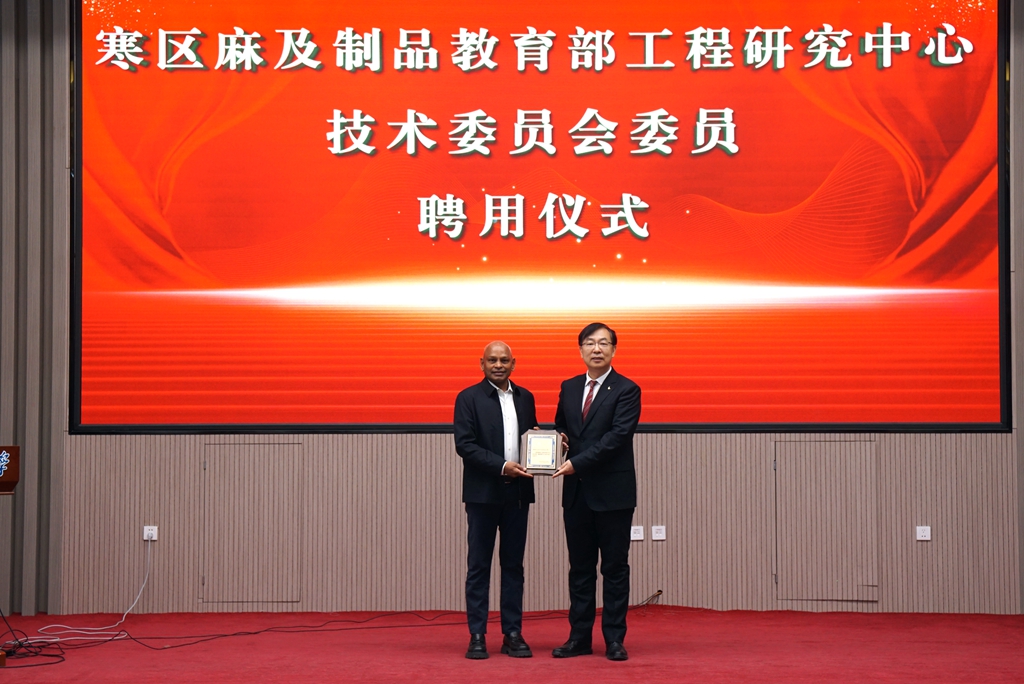 在聘任儀式上,校長郝文斌代表學(xué)校發(fā)表致辭,并為西拉姆院士頒發(fā)聘任證書。他表示,西拉姆院士的受聘不僅為寒區(qū)麻及制品教育部工程研究中心注入了國際化的學(xué)術(shù)視野,也將在新型紡織材料的功能化開發(fā)、先進制造工藝的優(yōu)化及可持續(xù)技術(shù)的應(yīng)用等方面提供強有力的學(xué)術(shù)支撐。依托西拉姆院士的前沿學(xué)術(shù)理念和豐富科研經(jīng)驗,寒區(qū)麻及制品教育部工程研究中心將在科研能力提升、學(xué)科建設(shè)優(yōu)化及產(chǎn)學(xué)研合作深化等方面持續(xù)探索,積極推動跨學(xué)科融合,拓展新型紡織材料的研究方向。同時,寒區(qū)麻及制品教育部工程研究中心將加強科技創(chuàng)新,推動關(guān)鍵技術(shù)的發(fā)展與應(yīng)用,促進創(chuàng)新成果的高效轉(zhuǎn)化,不斷提升學(xué)校在相關(guān)領(lǐng)域的學(xué)術(shù)影響力和技術(shù)創(chuàng)新能力,為學(xué)科建設(shè)和行業(yè)發(fā)展作出更大貢獻。