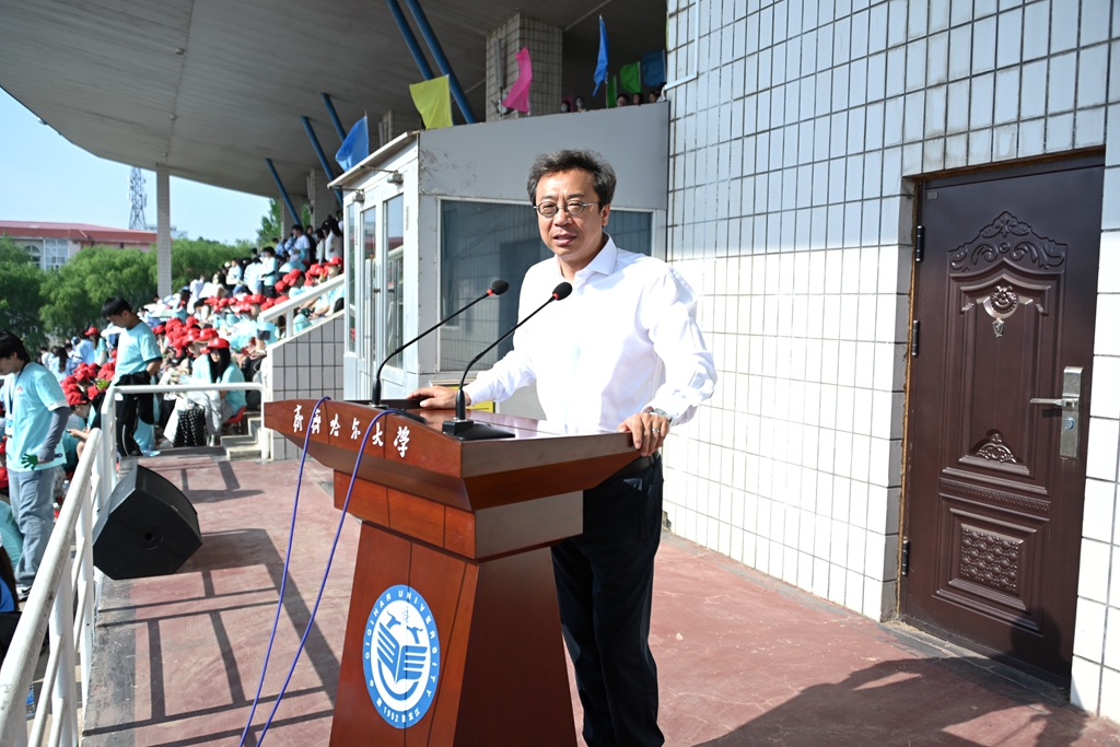 副校長范鐵明在致辭時表示,本屆田徑運動會是一次凝聚人心、振奮精神的盛會,更是一堂生動的“立德樹人”實踐課。在團(tuán)結(jié)奮進(jìn)、積極向上的體育競技氛圍中,全體運動員奮勇爭先、努力拼搏,取得了運動成績和精神文明雙豐收。希望全校師生員工積極助力學(xué)?!绑w教”深度融合,用體育運動之美展現(xiàn)砥礪奮進(jìn)、昂揚向上的齊大人精神風(fēng)貌,以更加強健的體魄、更加飽滿的熱情、更加昂揚的斗志,為推動學(xué)校改革發(fā)展匯聚強大合力,奮力書寫學(xué)校高質(zhì)量發(fā)展新篇章!(點擊觀看第二十四屆田徑運動會精彩瞬間)