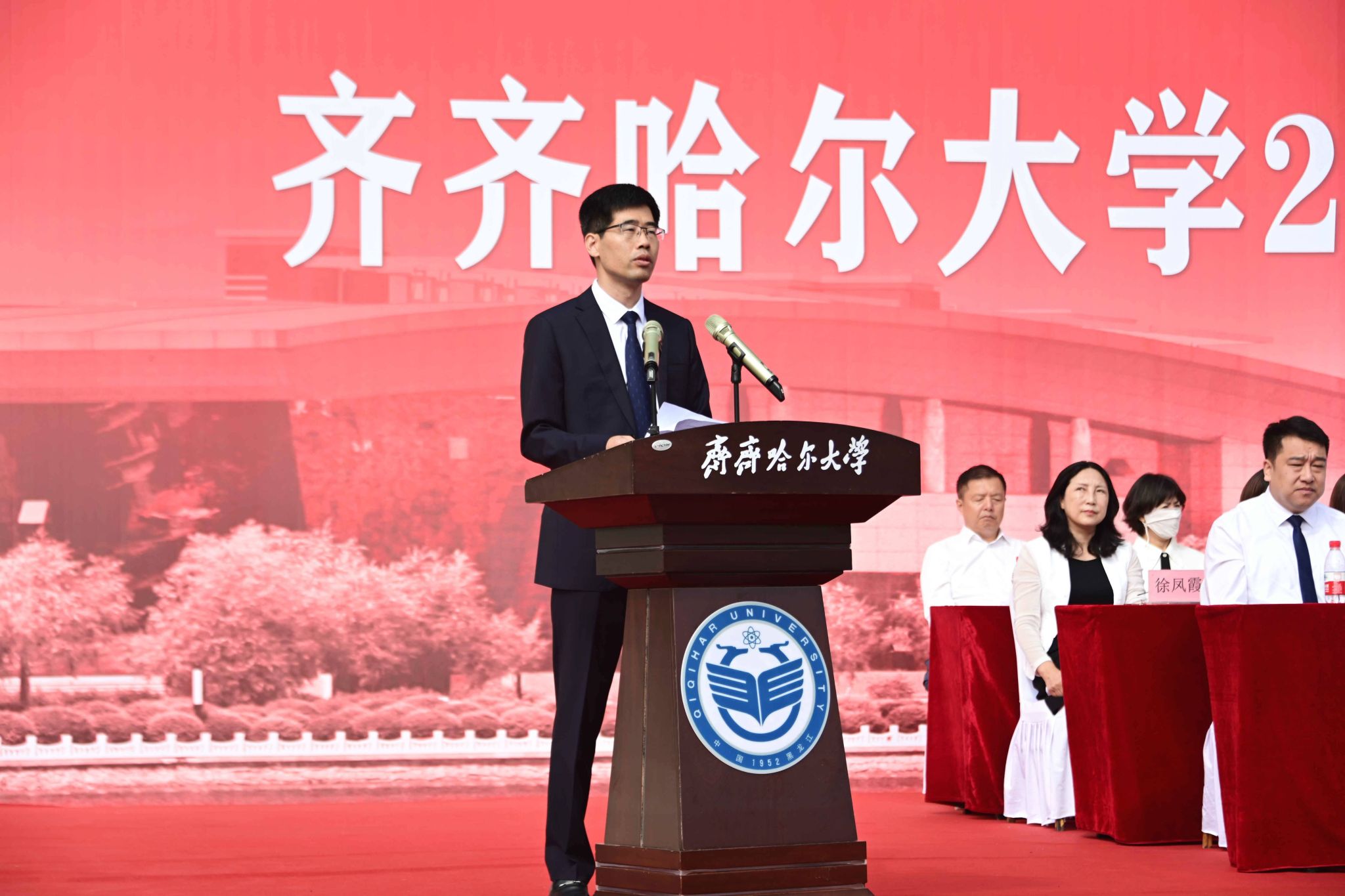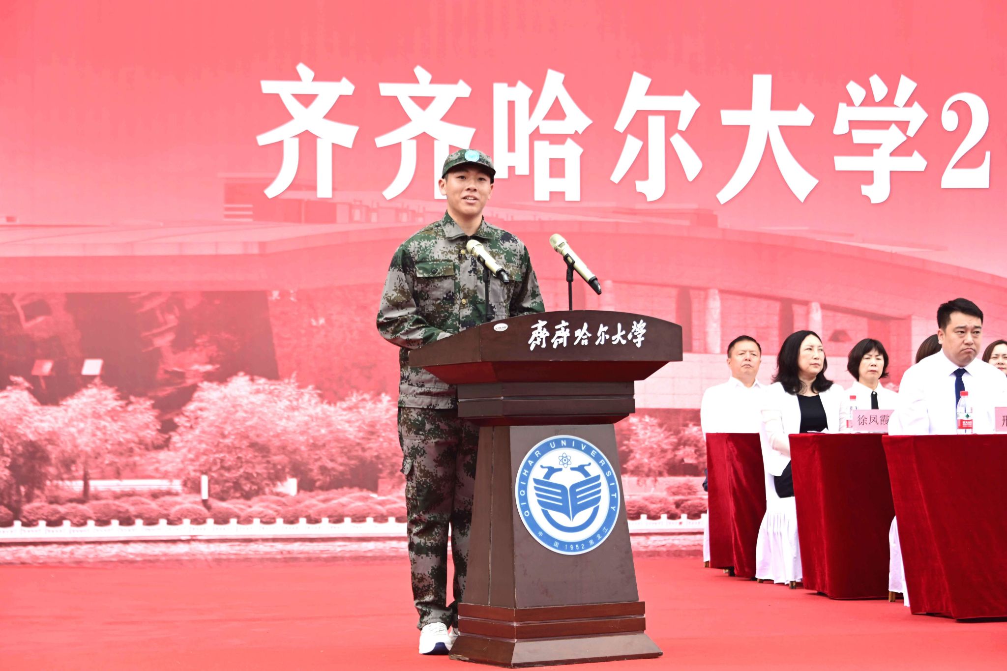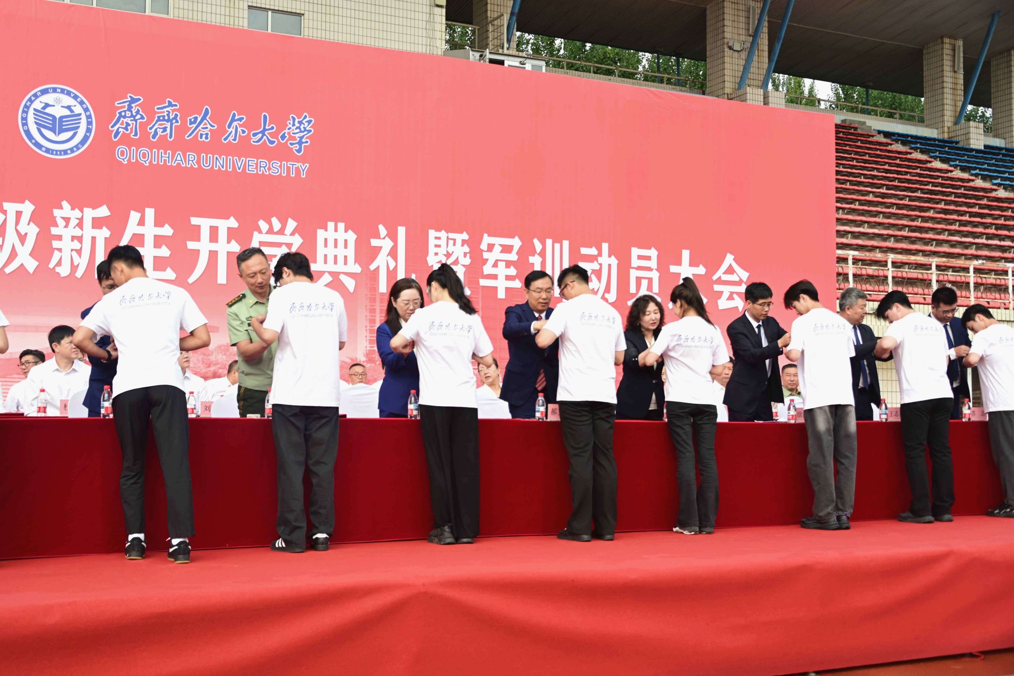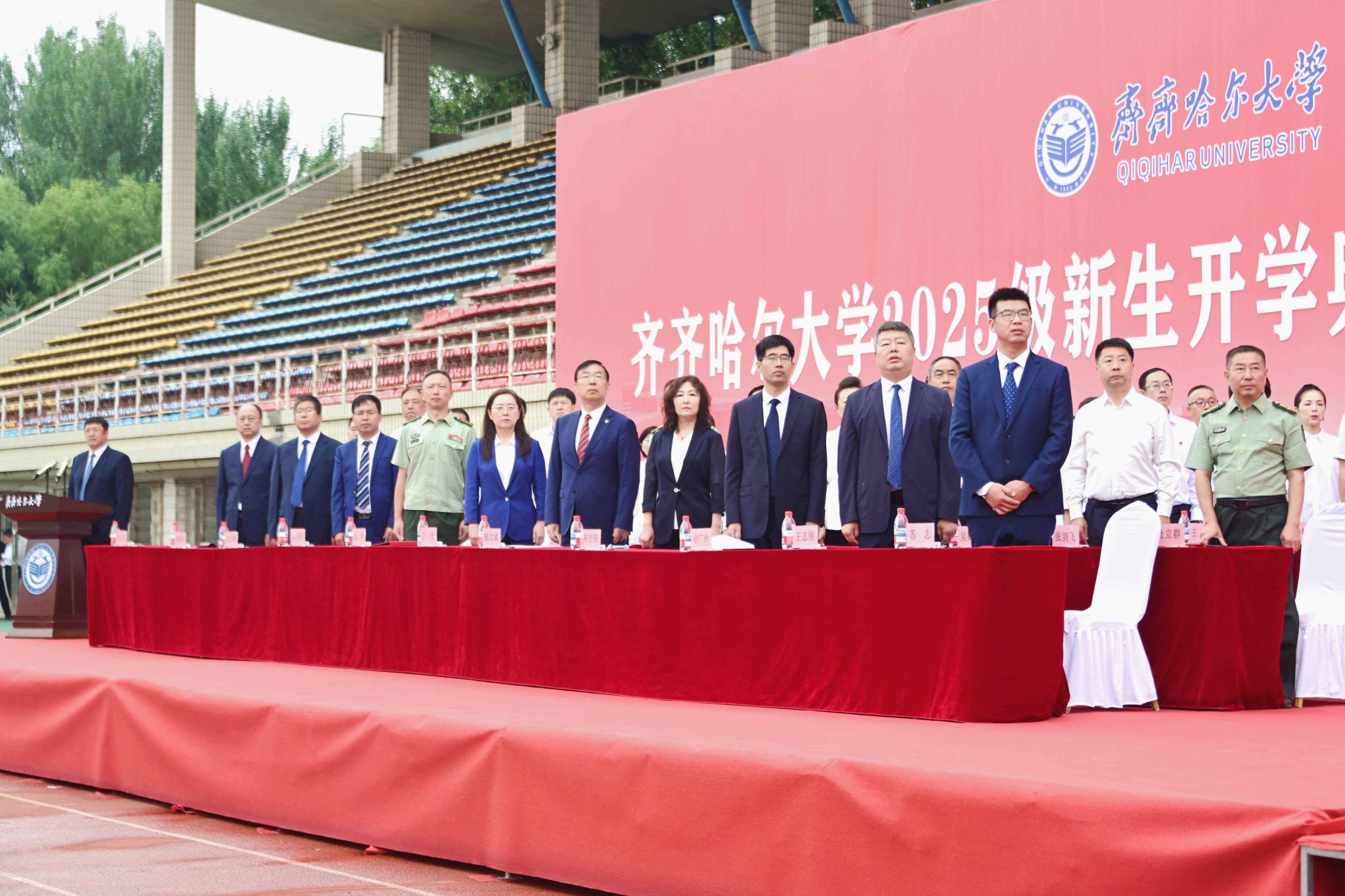 9月1日,齊齊哈爾大學(xué)2025級(jí)新生開學(xué)典禮暨軍訓(xùn)動(dòng)員大會(huì)在西區(qū)體育場(chǎng)舉行,學(xué)校全體領(lǐng)導(dǎo)班子成員、武警齊齊哈爾支隊(duì)上校支隊(duì)長(zhǎng)劉洋出席典禮,優(yōu)秀畢業(yè)生代表、學(xué)校軍訓(xùn)團(tuán)成員、各學(xué)院黨政負(fù)責(zé)人以及7000余名新生參加典禮。黨委副書記張文治主持典禮。