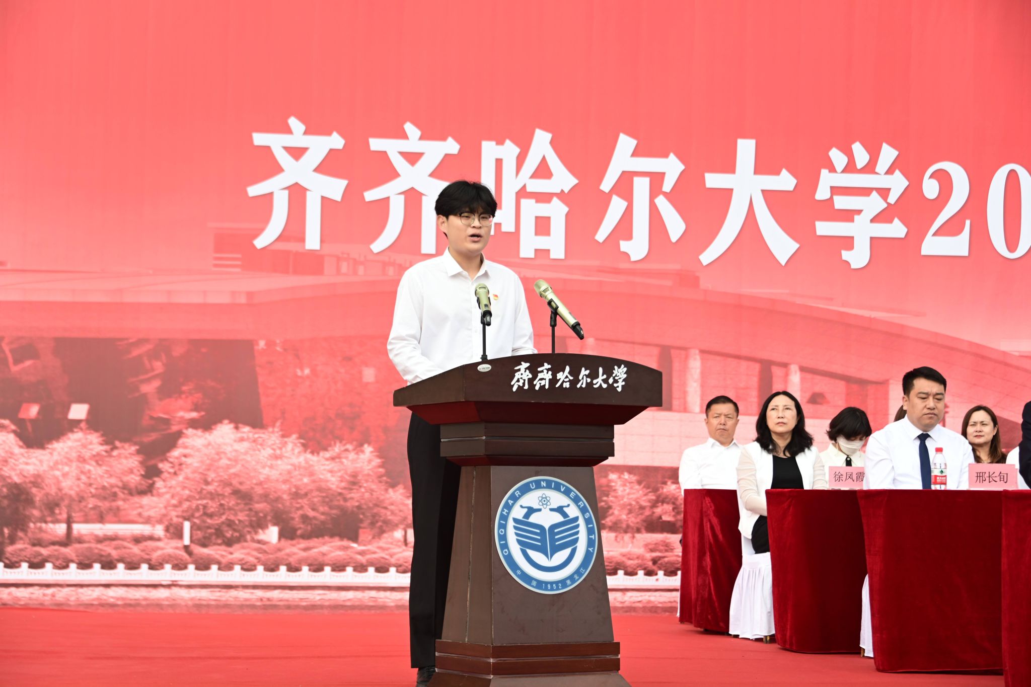 校領(lǐng)導(dǎo)為2025級(jí)新生代表佩戴?;?。閃亮的校徽,標(biāo)志著新生們正式成為“齊大人”,承載著學(xué)校的殷切期望,秉持“養(yǎng)正毓德 精存自生”校訓(xùn)精神,在腳踏實(shí)地的接續(xù)奮斗中建功立業(yè),努力成長(zhǎng)為擔(dān)當(dāng)民族復(fù)興大任的時(shí)代新人。