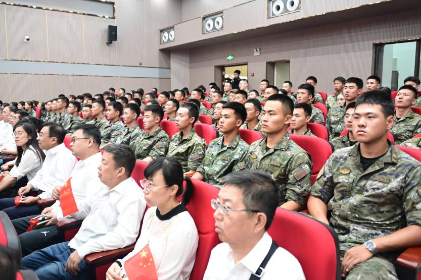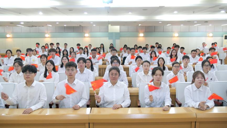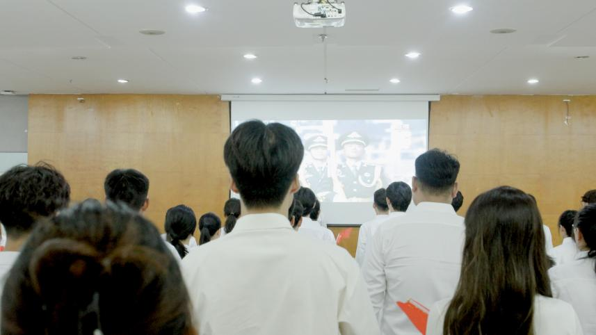 閱兵正式開始時,嘹亮的國歌聲通過屏幕傳來,全體師生莊嚴肅立,與現(xiàn)場同頻,齊聲高唱,雄壯的旋律在校園的每一個角落回蕩。