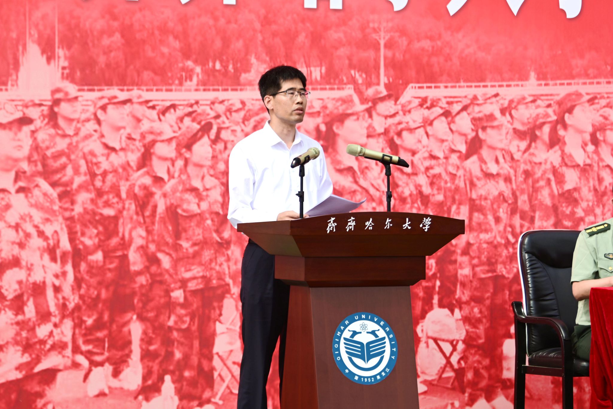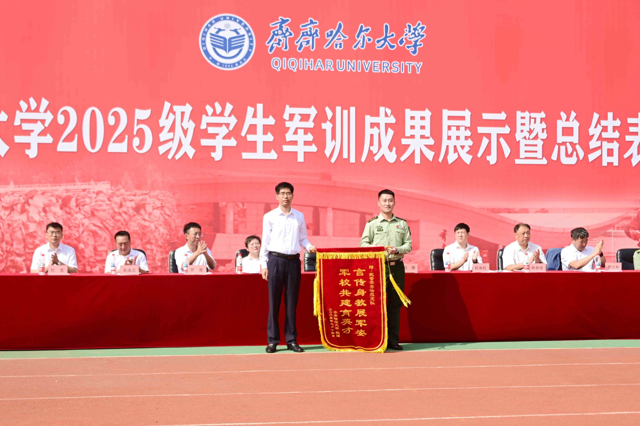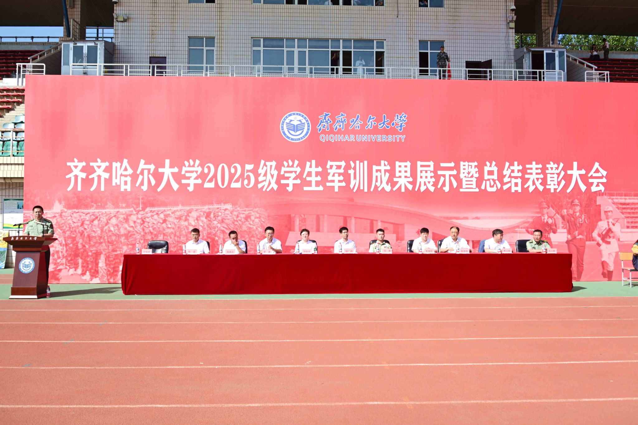 9月14日,學(xué)校2025級(jí)學(xué)生軍訓(xùn)成果展示暨總結(jié)表彰大會(huì)在西區(qū)體育場(chǎng)舉行。副校長(zhǎng)、軍訓(xùn)團(tuán)政委徐廣洲,武警齊齊哈爾支隊(duì)少校副參謀長(zhǎng)劉操出席大會(huì),校武裝部部長(zhǎng)、軍訓(xùn)團(tuán)參謀長(zhǎng)于佳賓主持大會(huì)。
