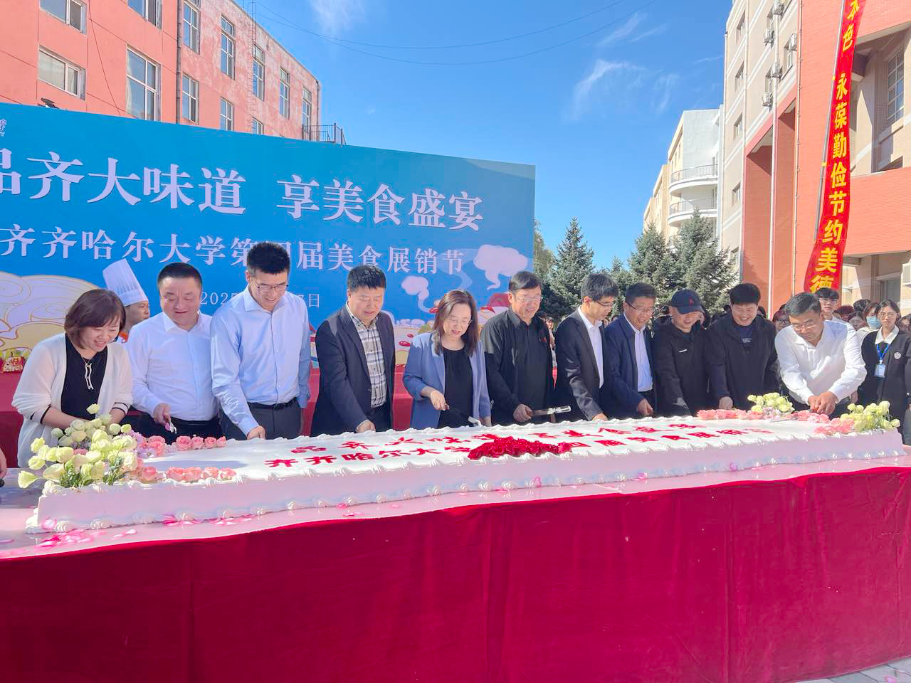 校黨委書記丁宏宣布第四屆校園美食展銷節(jié)活動啟動,校領(lǐng)導(dǎo)與嘉賓共同為師生分發(fā)蛋糕,送上美好祝福。
