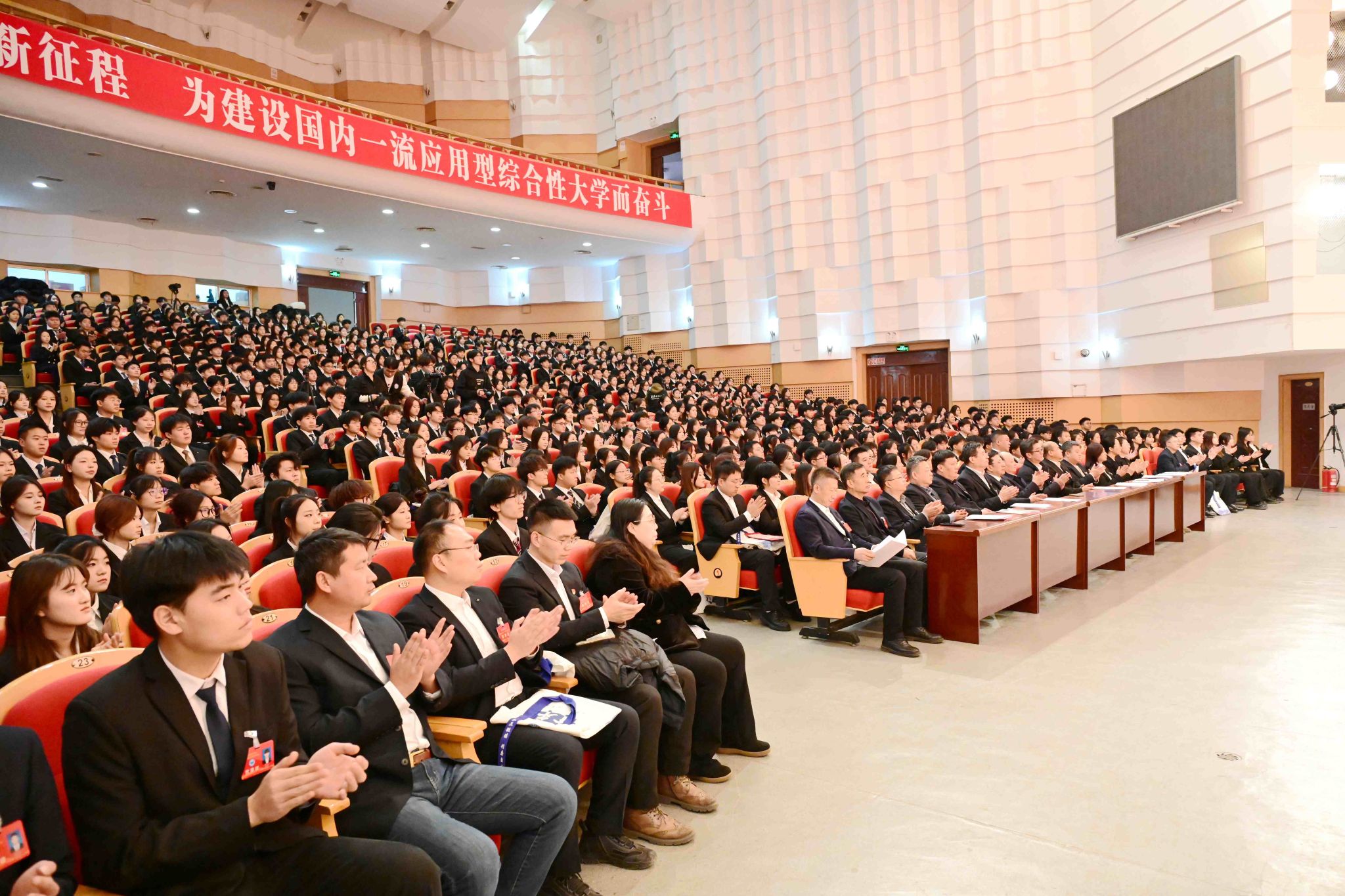 校學(xué)生會(huì)執(zhí)行主席張巖在第八次學(xué)生代表大會(huì)第一次全體會(huì)議上代表第七屆學(xué)生會(huì)委員會(huì)作工作報(bào)告;校研究生會(huì)執(zhí)行主席高梓淇在第六次研究生代表大會(huì)第一次全體會(huì)議上代表第五屆研究生會(huì)委員會(huì)作研究生會(huì)工作報(bào)告。