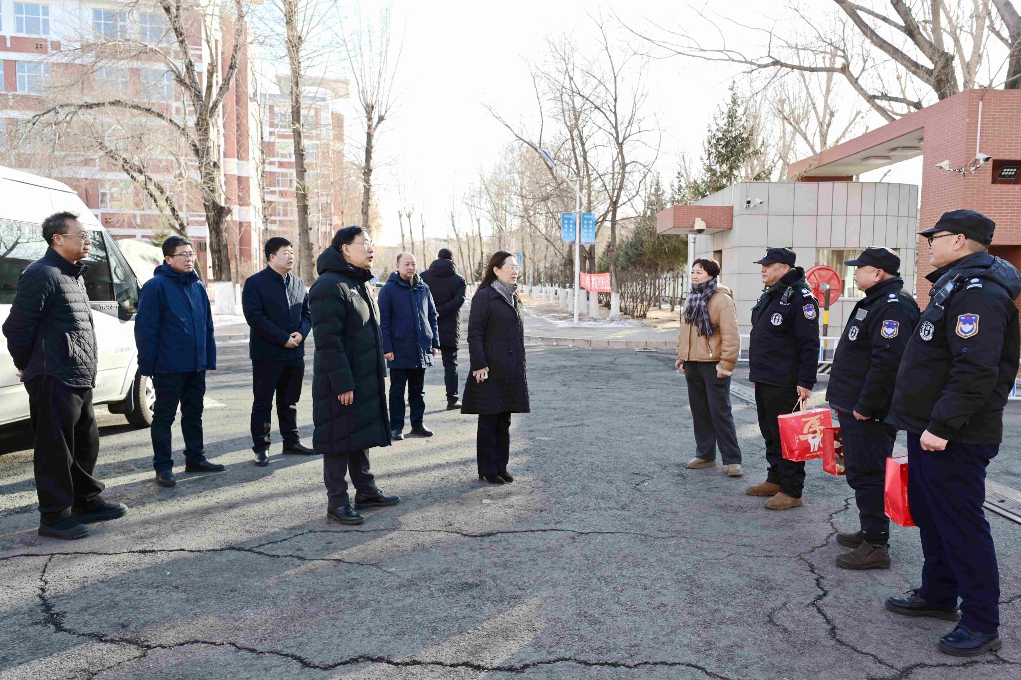 校領(lǐng)導(dǎo)一行先后來(lái)到德潤(rùn)大廈、培訓(xùn)中心、鍋爐房、變電所、中區(qū)門衛(wèi)、辦公樓值班室、110指揮中心、119指揮中心等地。每到一處,校領(lǐng)導(dǎo)都與值班人員親切握手、熱情交談,詳細(xì)詢問(wèn)春節(jié)期間的工作安排、生活保障及輪休情況,并送上精心準(zhǔn)備的節(jié)日慰問(wèn)品。